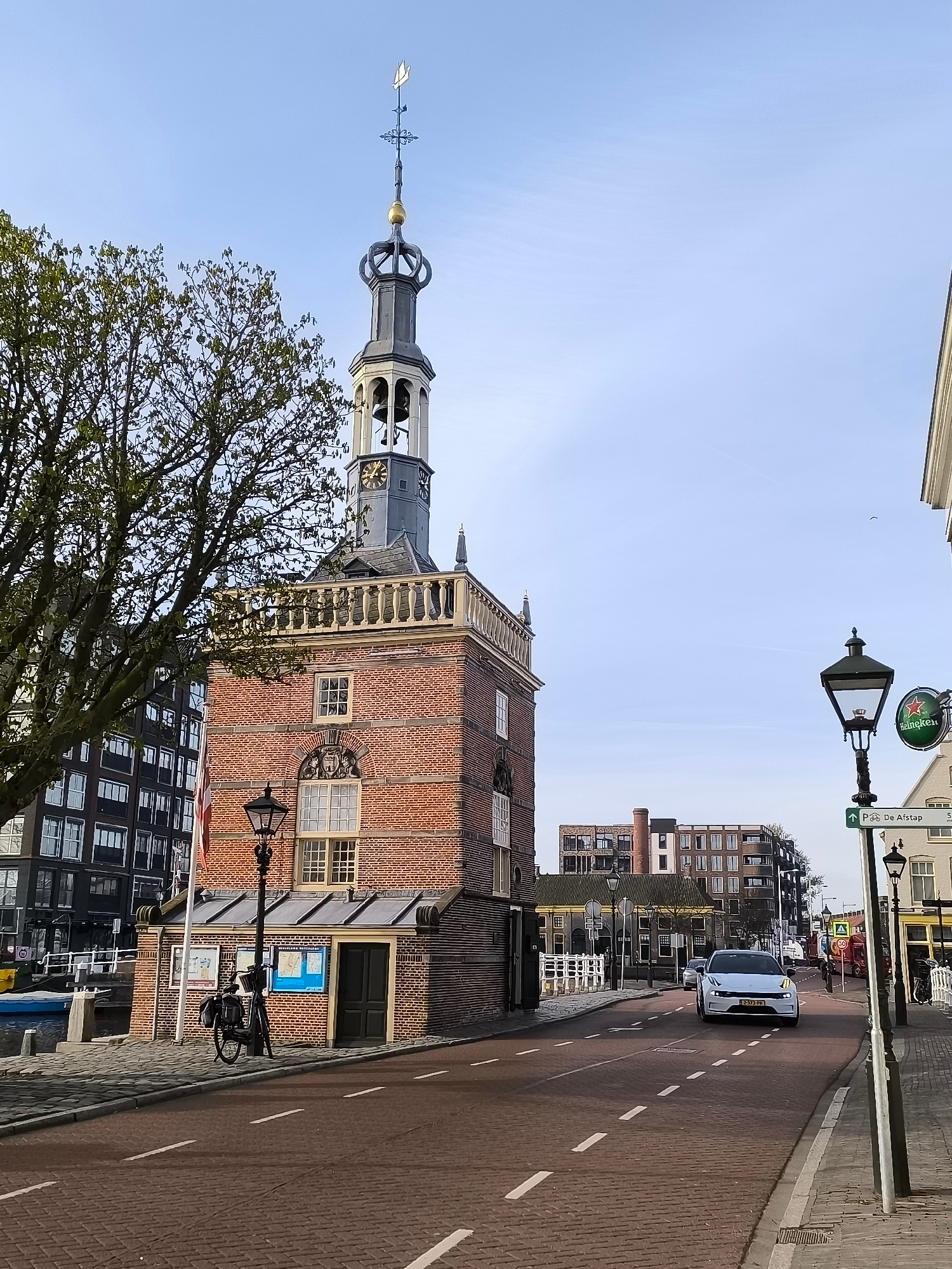 The image depicts the Accijnstoren in Alkmaar, Netherlands. This historic building, identifiable by its distinctive brick facade and clock tower, stands beside a tree. A bicycle is parked adjacent to…read more