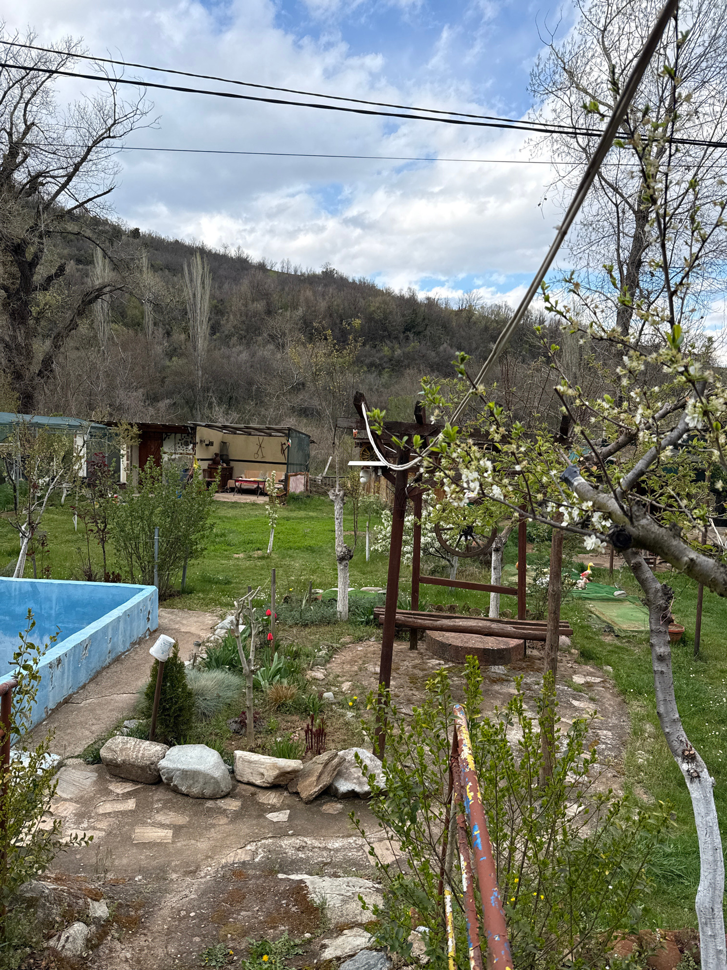 The image shows a yard in Pokrovnik, Bulgaria. A brown wooden structure stands in the foreground, beneath a flowering tree. The path leading to the house consists of concrete slabs and stones. The hou…read more