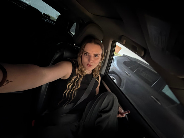 The image presents a female subject taking a selfie from within a vehicle, situated in San Bernardino Tlaxcalancingo, Mexico. The subject is an adult female with long, wavy blonde hair and a neutral e…read more