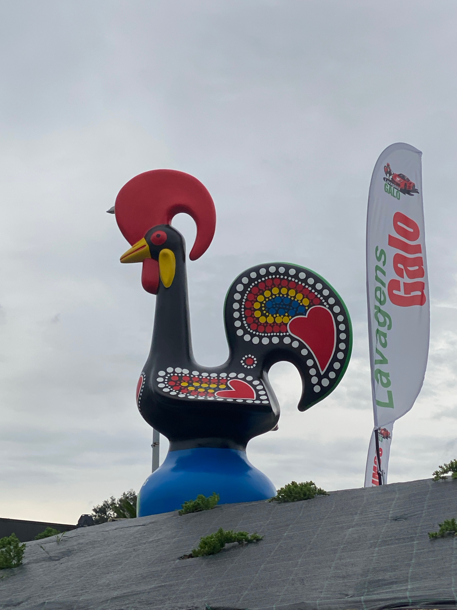 The image features a colorful, stylized rooster statue, known as the "Galo de Barcelos," against a backdrop of a cloudy sky and a partial view of a building. The rooster is predominantly black with re…read more