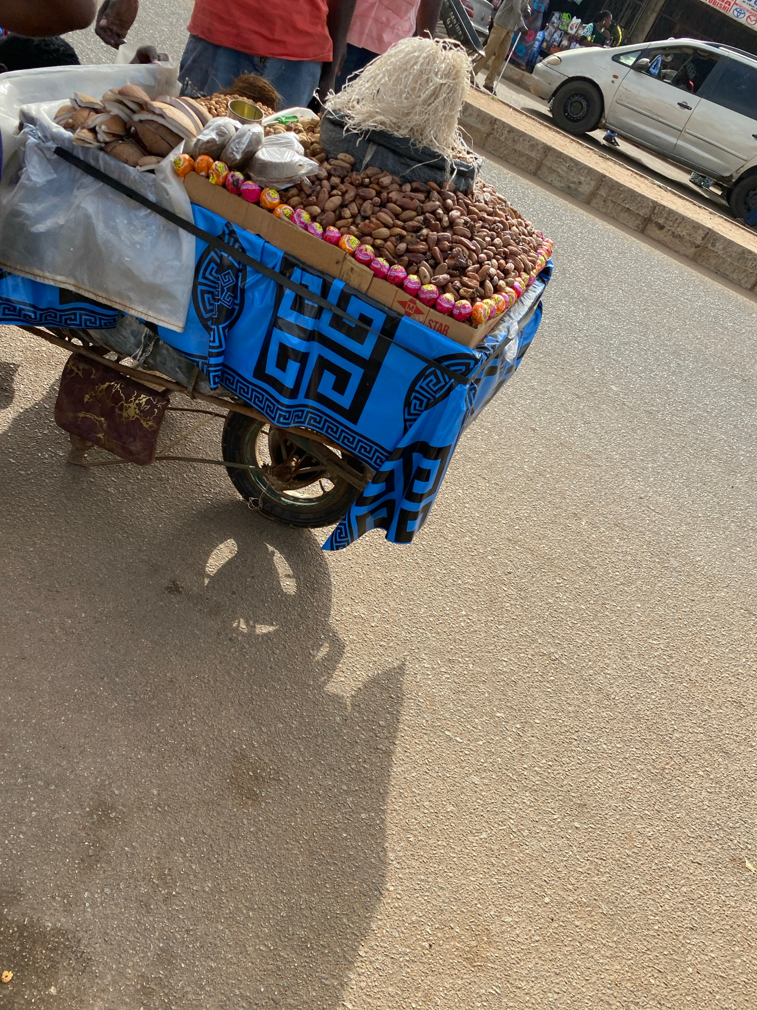 This image, captured in Bukuru, Nigeria, depicts a street vending scene under bright sunlight, likely in the morning or late afternoon given the long shadows on the pavement. The primary focus is a ve…read more