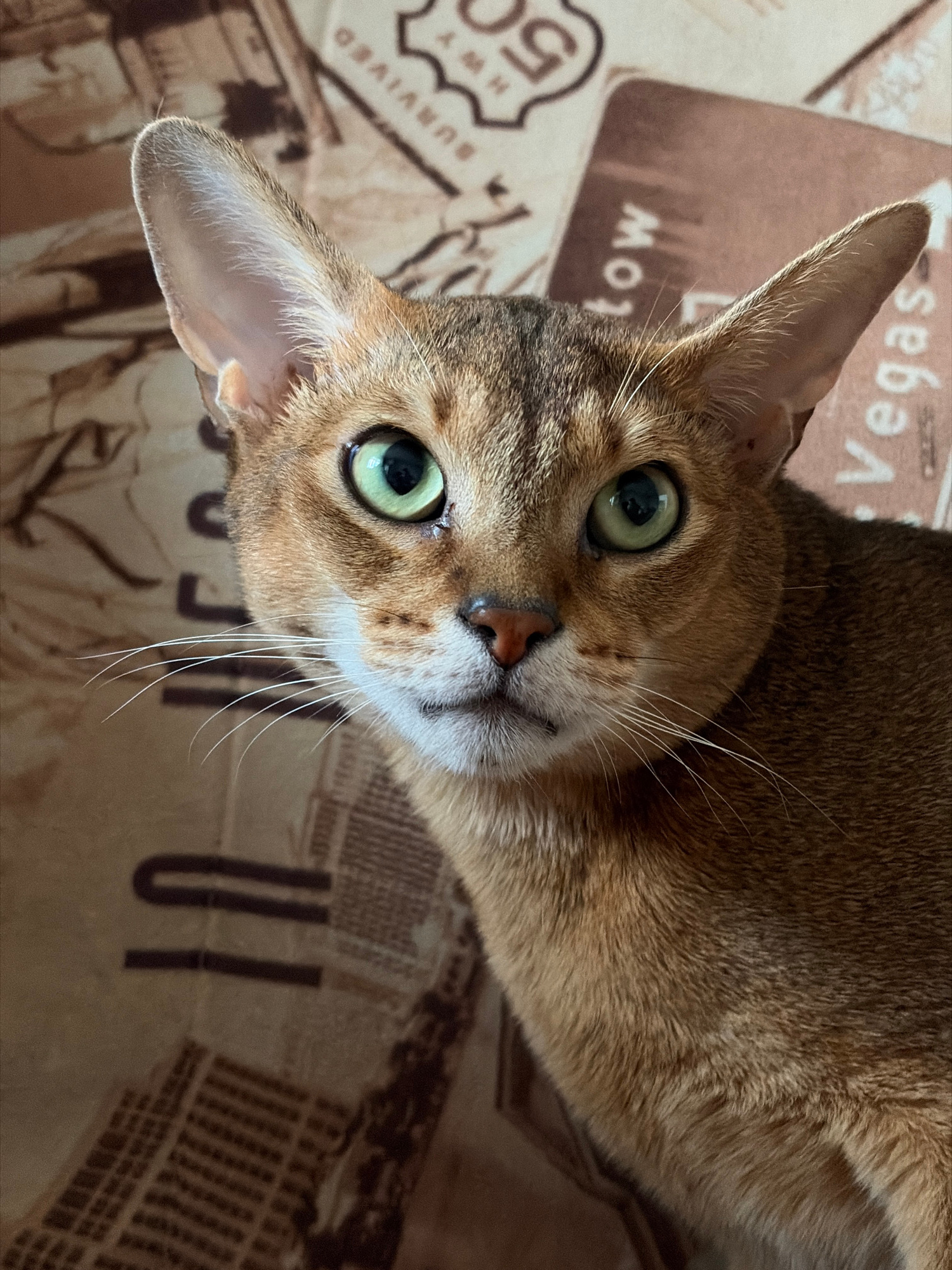 A close-up, high-angle shot depicts a light brown cat with a striped head and prominent, pointed ears. The cat possesses striking green eyes and several long, white whiskers. The background appears to…read more