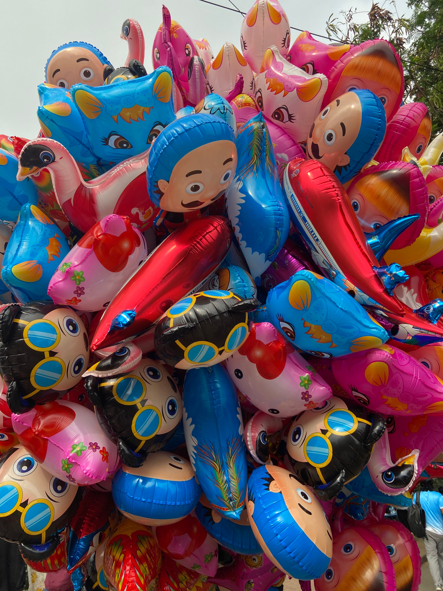A dense cluster of inflated foil balloons fills the frame, their reflective surfaces catching the light. The balloons depict various cartoon characters and designs, including stylized human faces with…read more