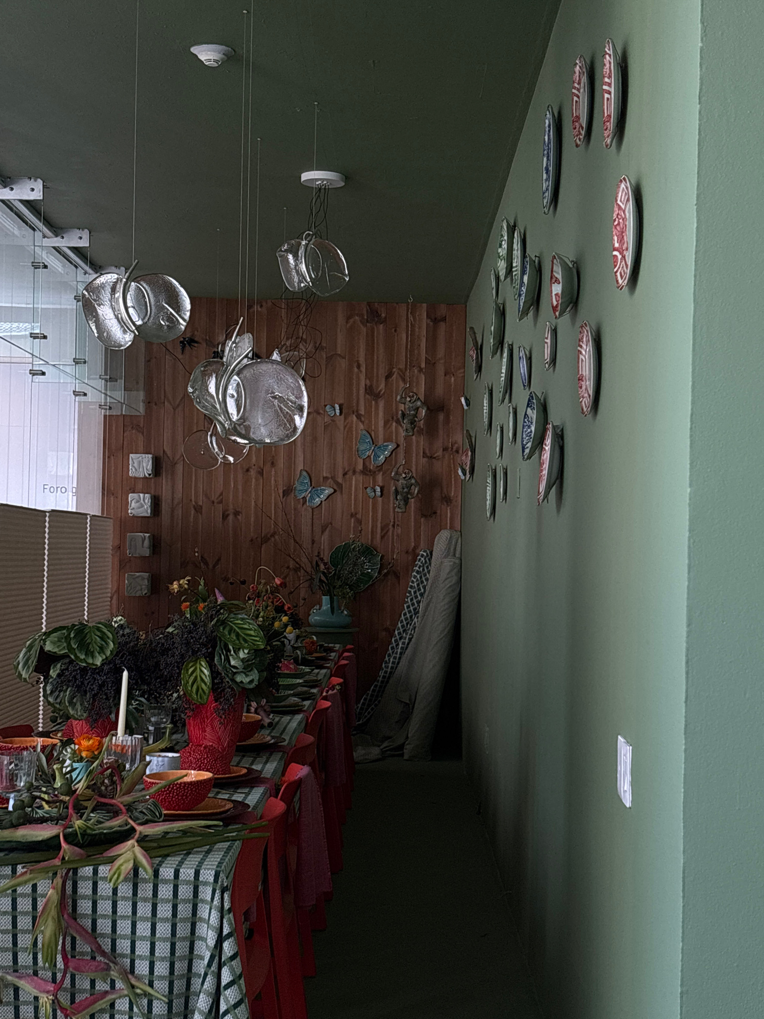 This image, likely taken indoors, reveals a room with a green ceiling adorned with numerous decorative plates. A multi-pendant light fixture hangs on the left side of the frame. A wooden wall decorate…read more