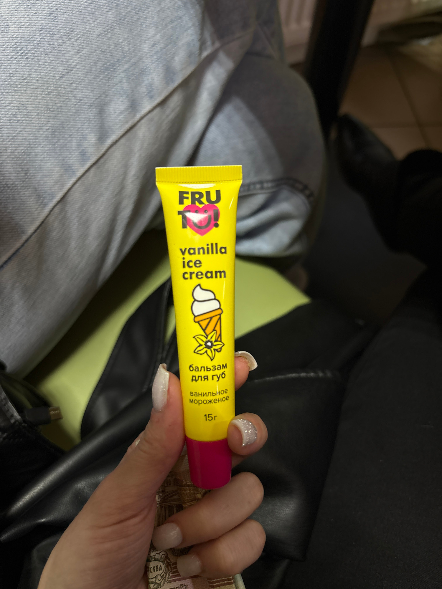 The image shows a hand holding a yellow tube of Fruity Vanilla Ice Cream lip balm with a pink cap. The tube is held against a backdrop of denim jeans and a black leather purse. The fingernails on the…read more