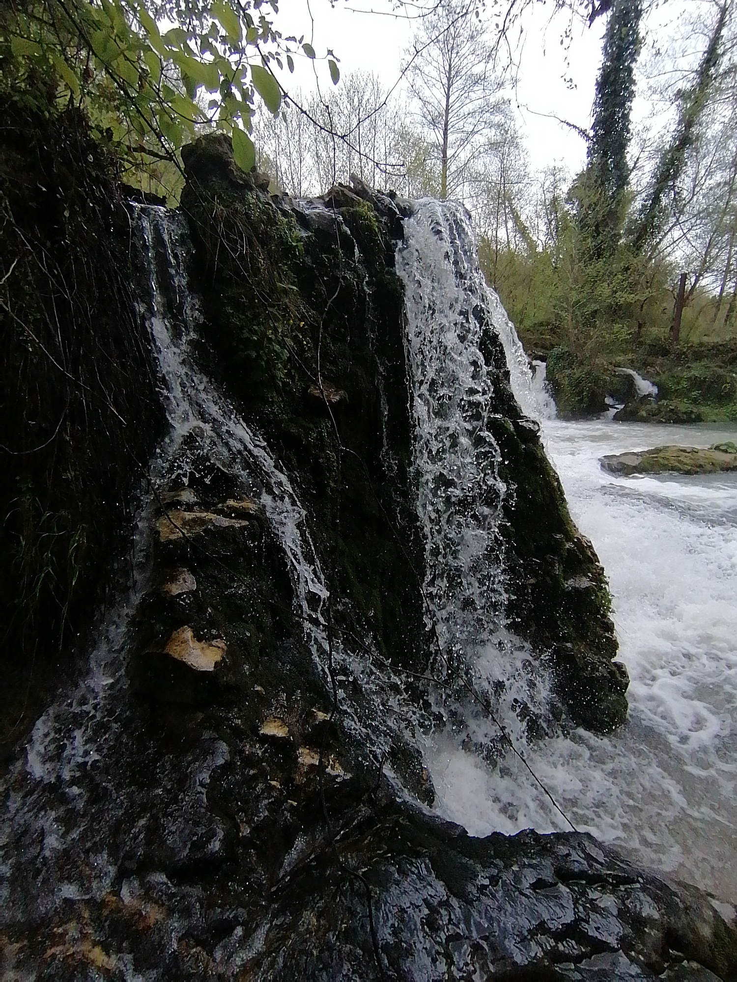 The image captures a vibrant natural scene featuring a multi-tiered waterfall cascading over dark, moss-covered rocks. The waterfall occupies the left and central foreground, with water vigorously spl…read more