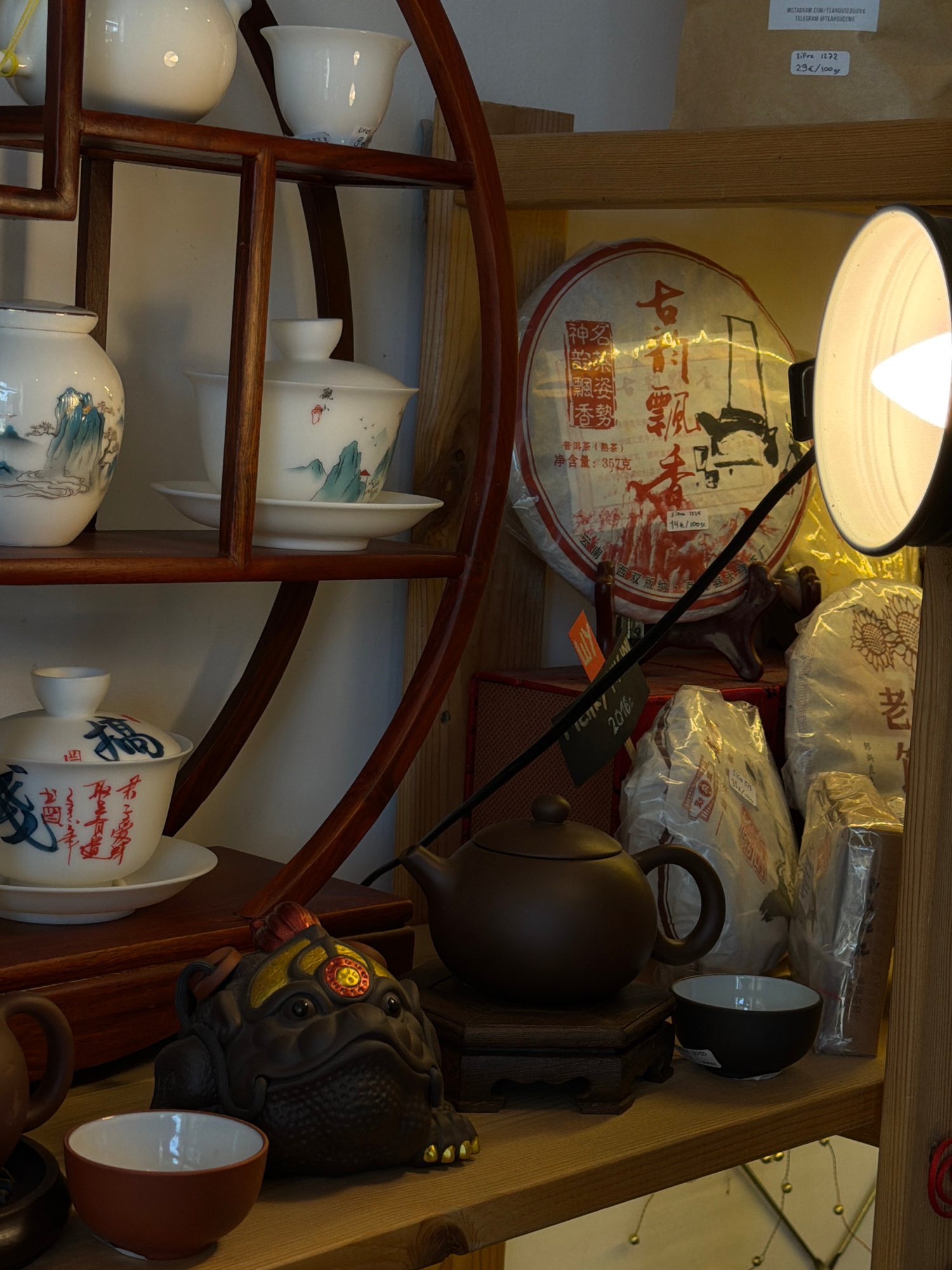 The image shows a shelf full of tea-related items. There is a light illuminating a round, flat cake of what appears to be tea. Text in Chinese is visible on the tea cake. Behind it, there are packages…read more