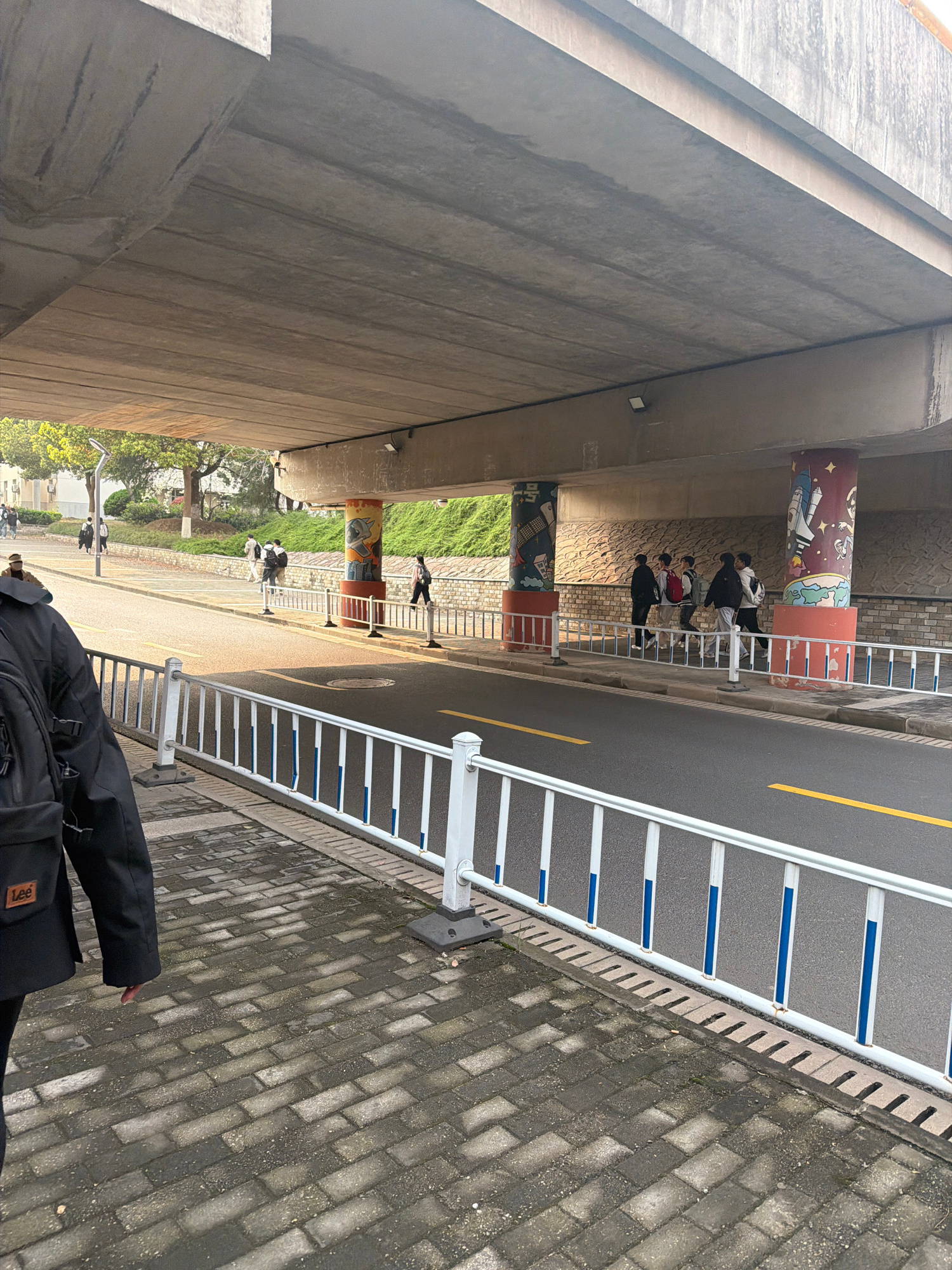 The image shows an outdoor scene in Jiangning District, China, from a high, angled perspective looking down. A concrete overpass structure dominates the left side of the frame, casting shadows. A road…read more