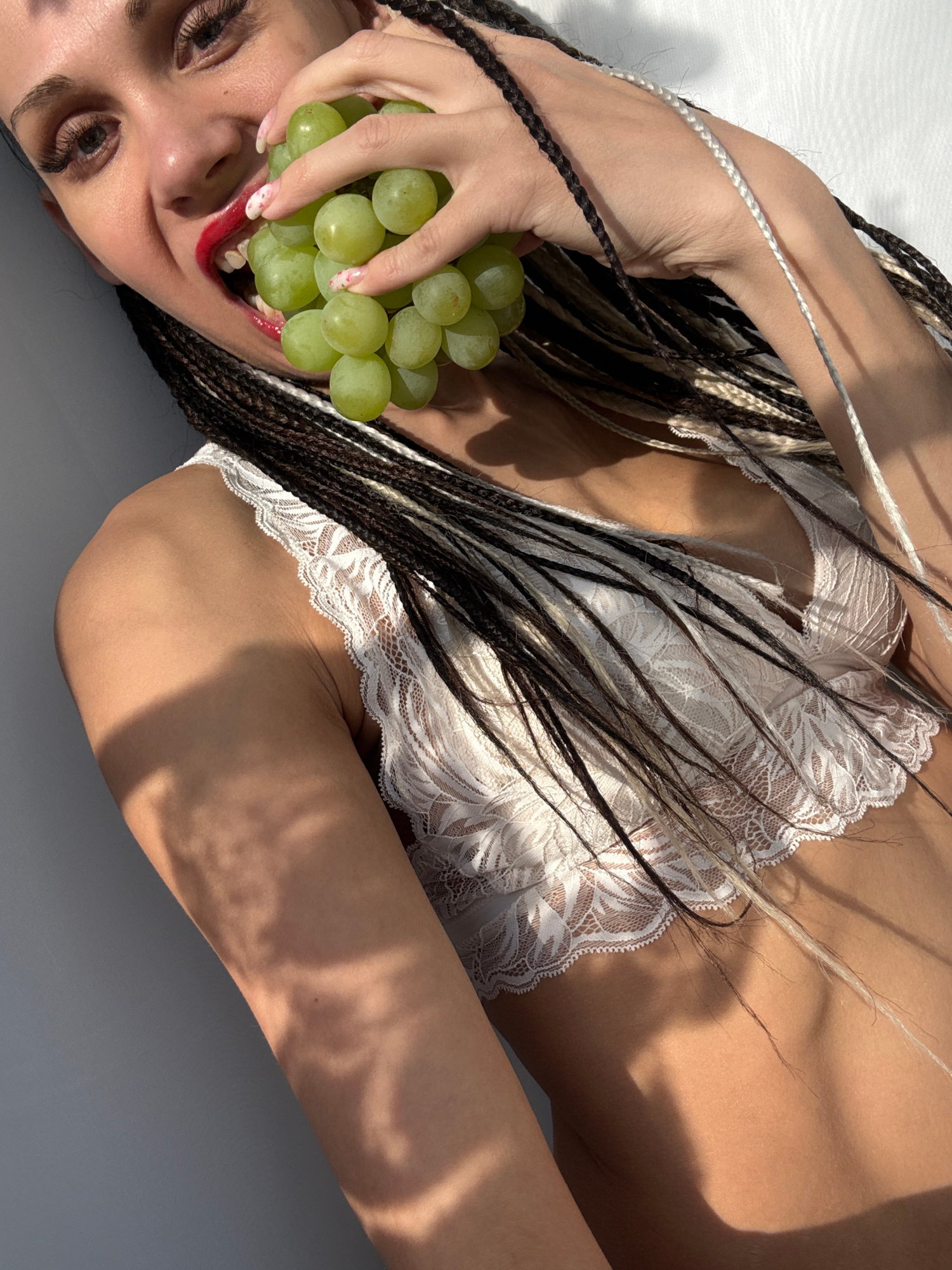 A woman with braided hair is lying down, holding a bunch of green grapes up to her mouth. She is wearing a white lace top. The scene is lit by natural light, casting shadows across her body. The locat…read more