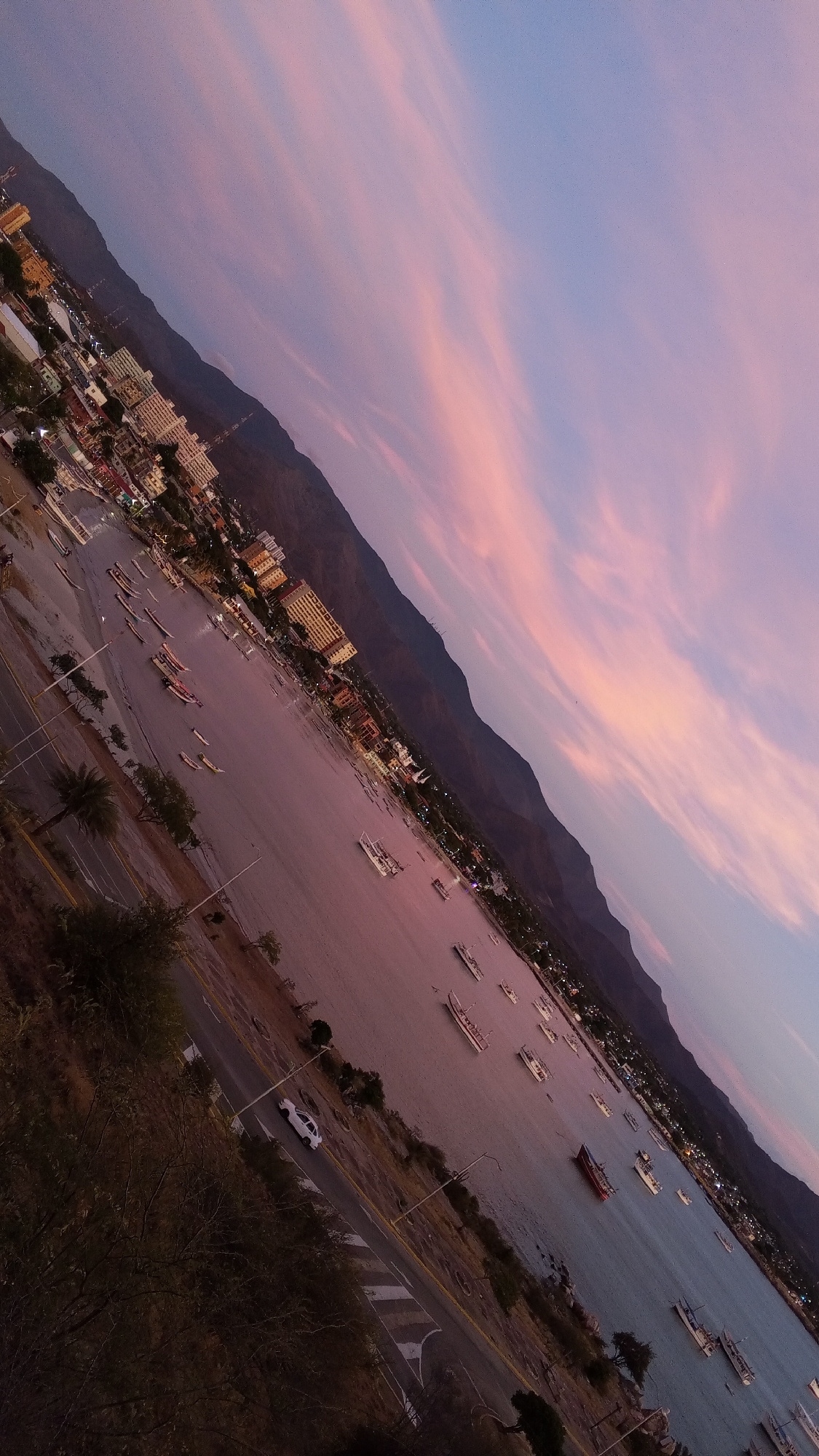 The image shows a view of Juan Griego, Venezuela, at sunset. The camera is angled, creating a diagonal composition. In the foreground, a road runs alongside the water, with a white car visible. The wa…read more