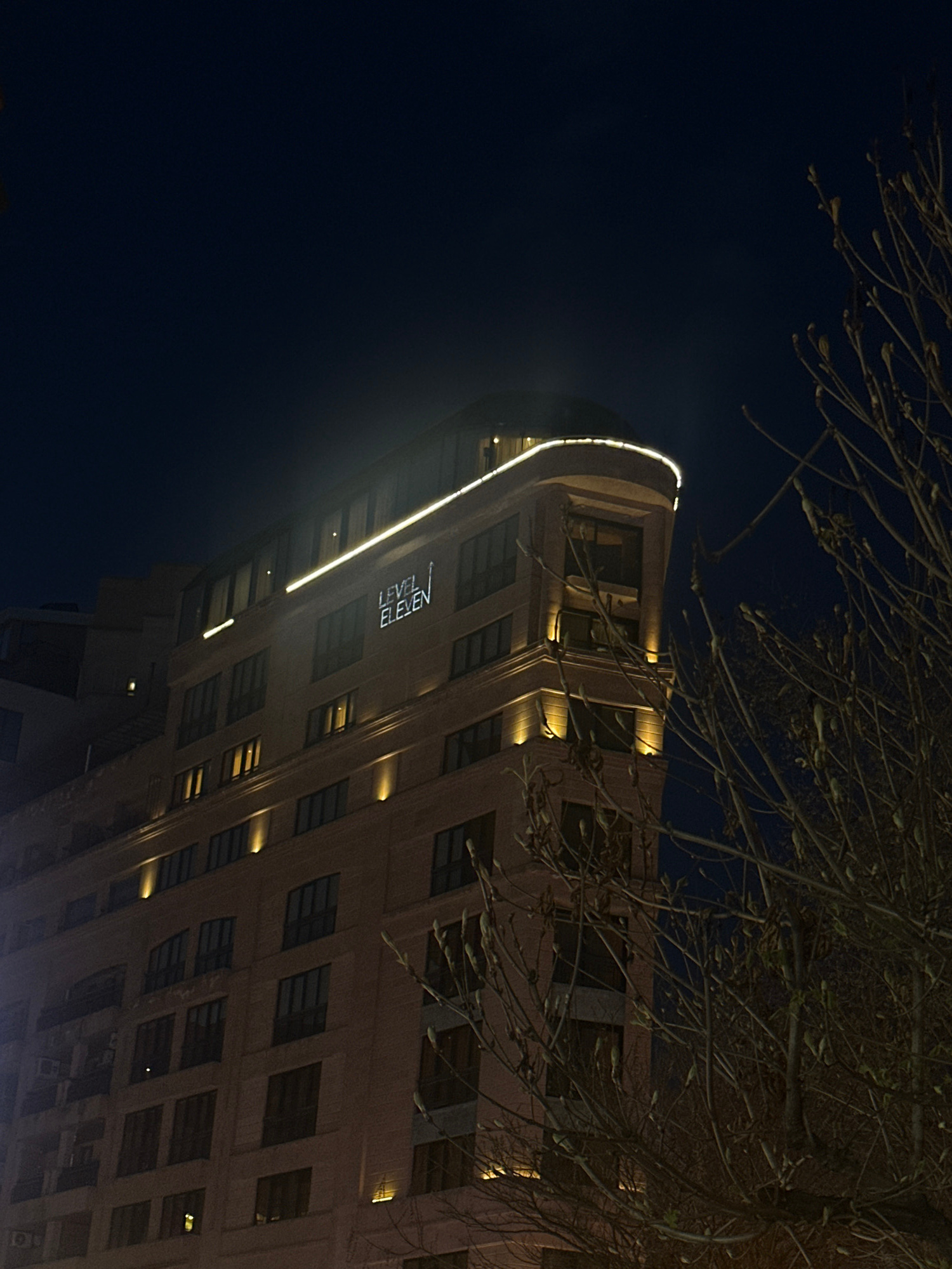 The image shows a building at night, likely in Yerevan, Armenia, given the text "LEVEL ELEVEN" on the building's façade, which corresponds to a hotel in that city. The building has a distinctive curve…read more