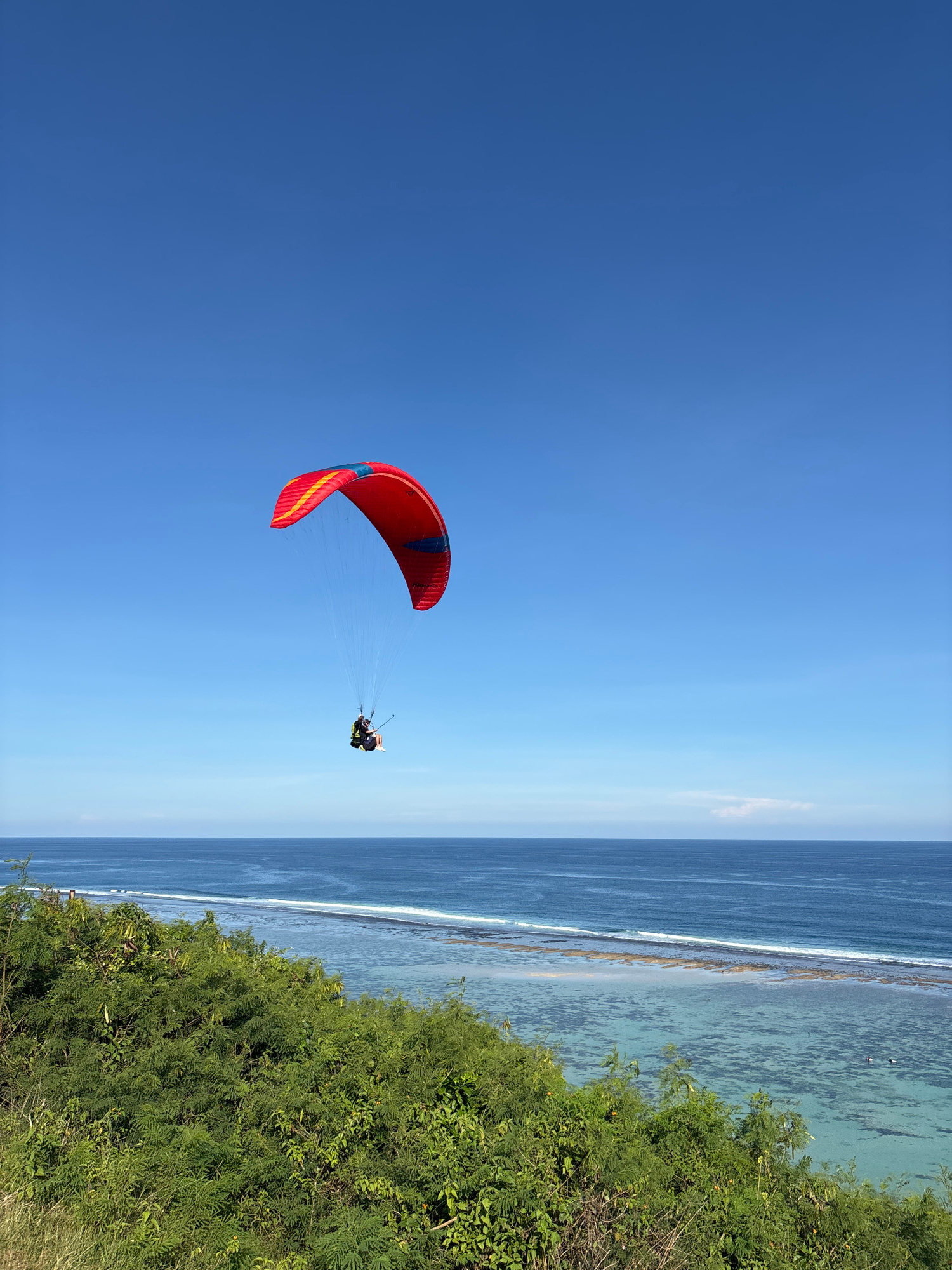 The image depicts a paraglider in flight against a clear blue sky, set against the backdrop of the coastline of Kuta Selatan, Indonesia. The paraglider is red with yellow and blue accents. The ocean i…read more