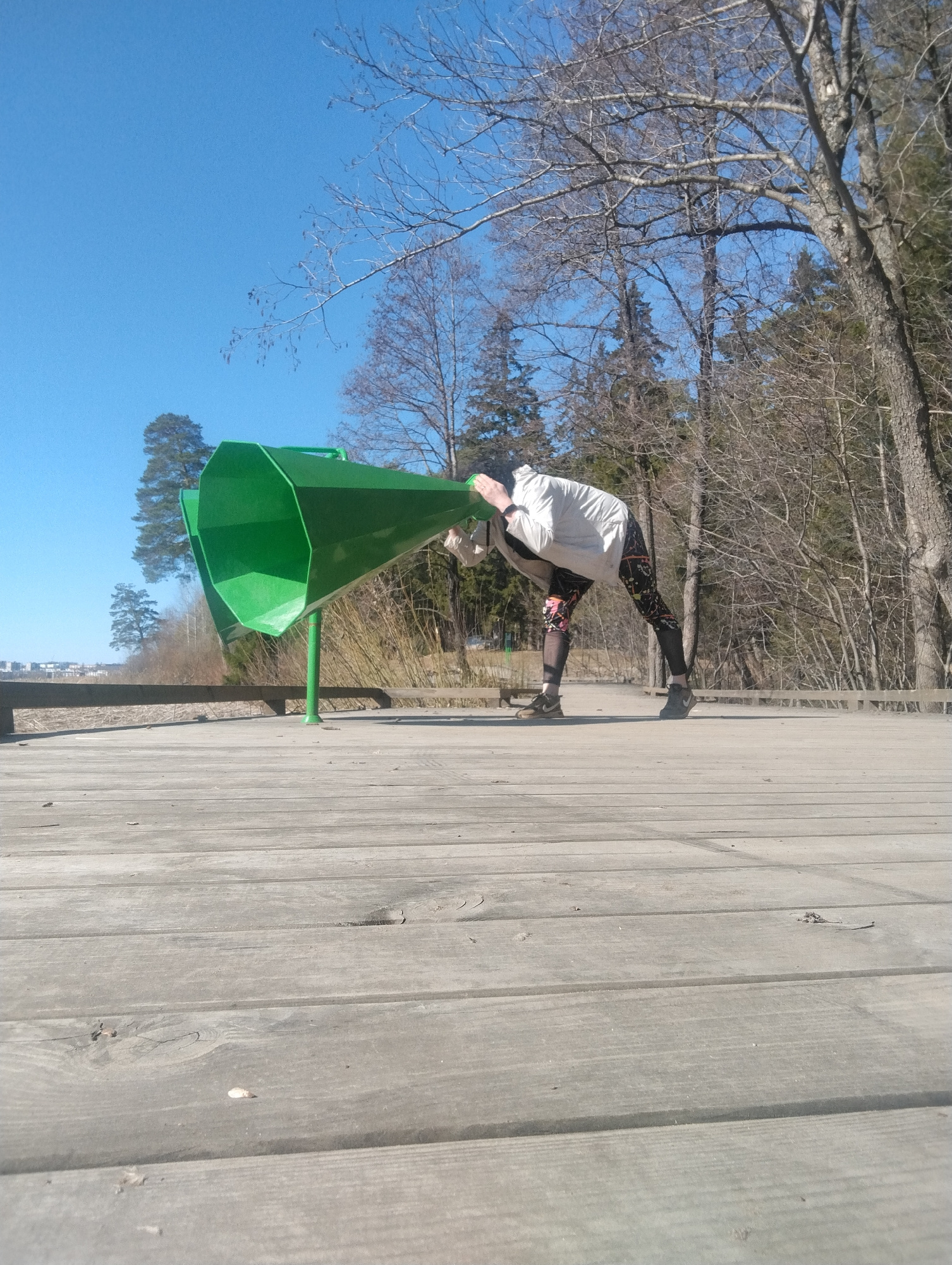 On a clear day in Votkinsk, Russia, a person in athletic leggings and a light-colored jacket bends over, placing their head inside one of two large, green, megaphone-shaped sound sculptures on a woodeβ¦read more