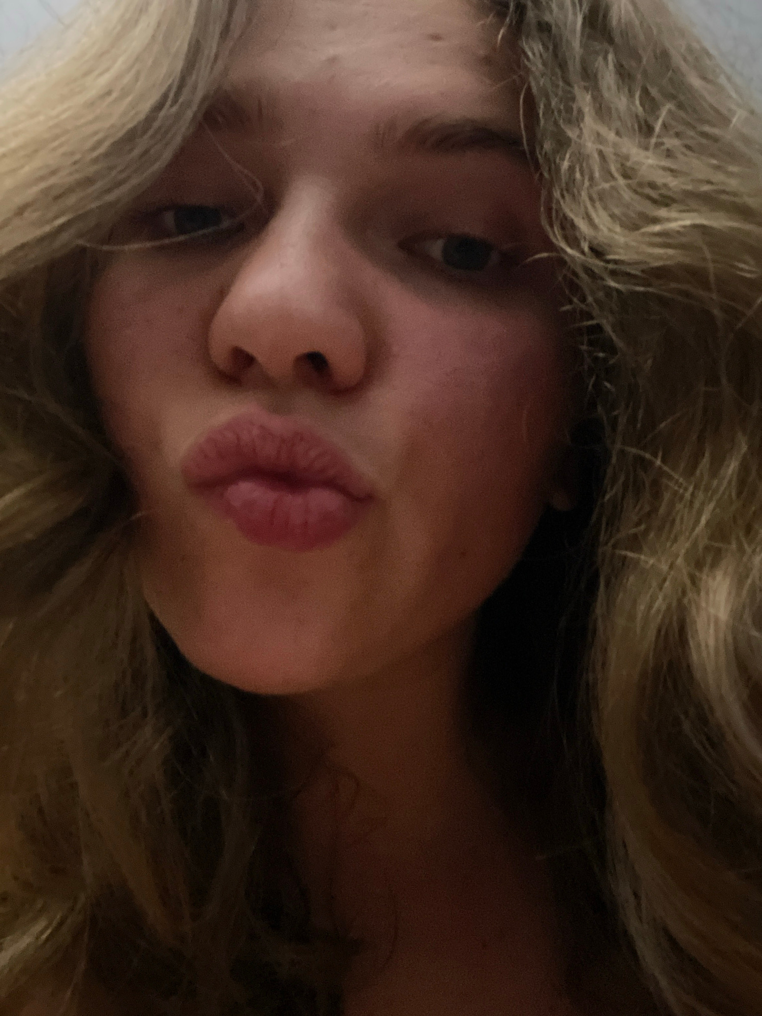 A close-up selfie of a fair-skinned person with light blonde hair. The person is positioned with their face at an angle. Their eyes are dark, and their lips are slightly pursed. The background is out…read more