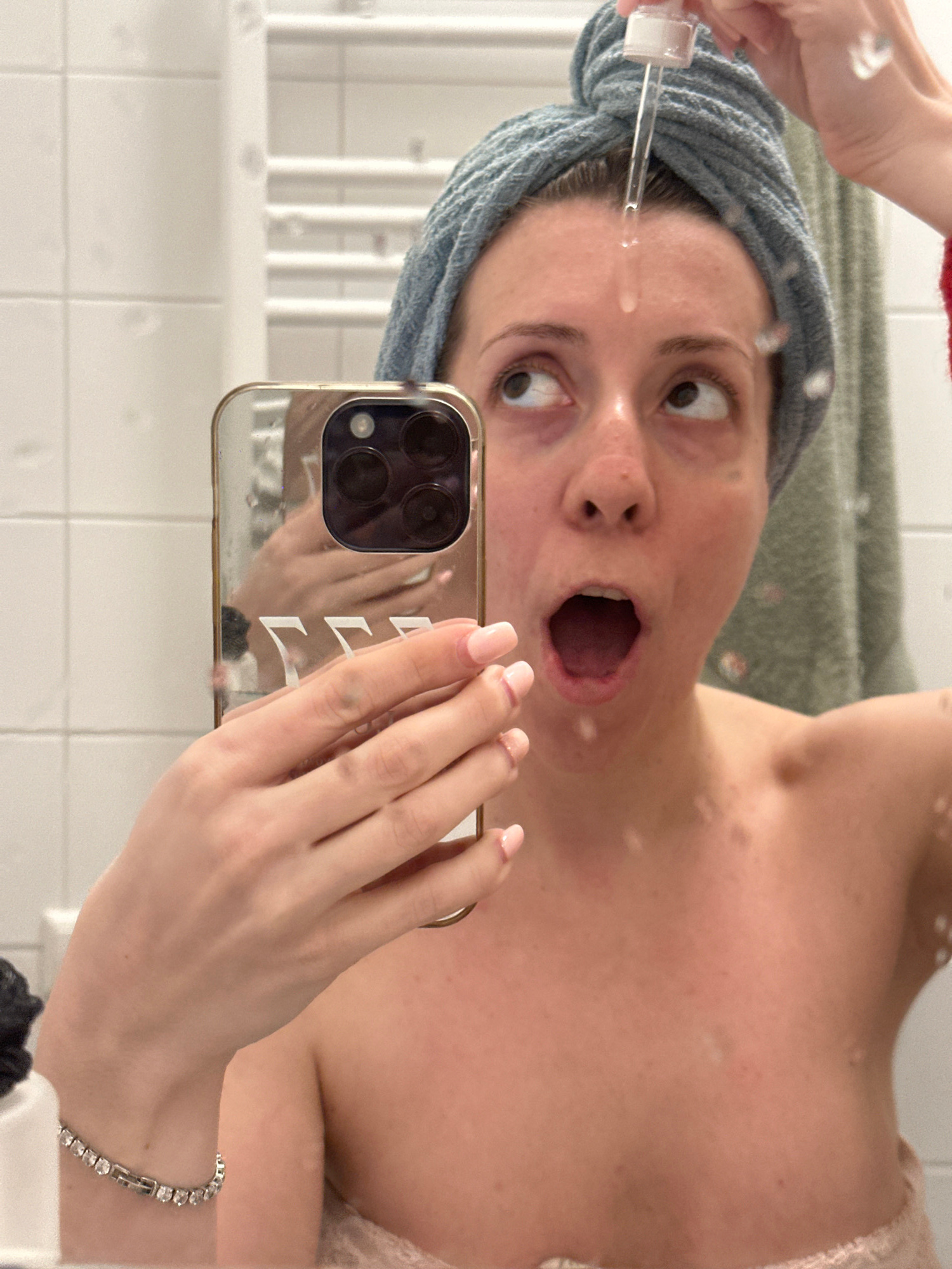 The image is a selfie taken by a woman in a bathroom setting. She is holding a smartphone with a gold-colored case and multiple camera lenses. The woman is wearing a blue towel on her head and appears…read more