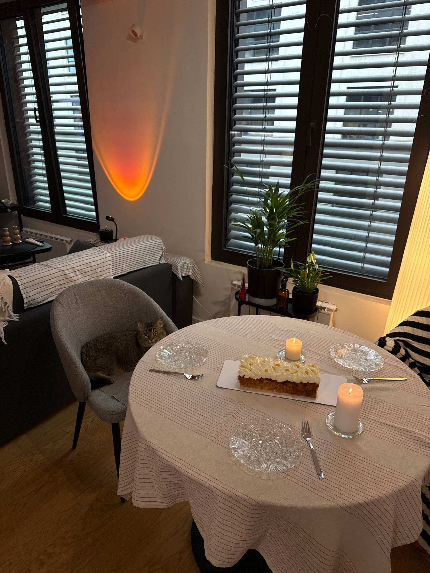 The image displays an indoor living or dining space, consistent with an urban residential apartment in Belgrade, Serbia. A round table, draped with a light beige tablecloth featuring thin dark stripes…read more