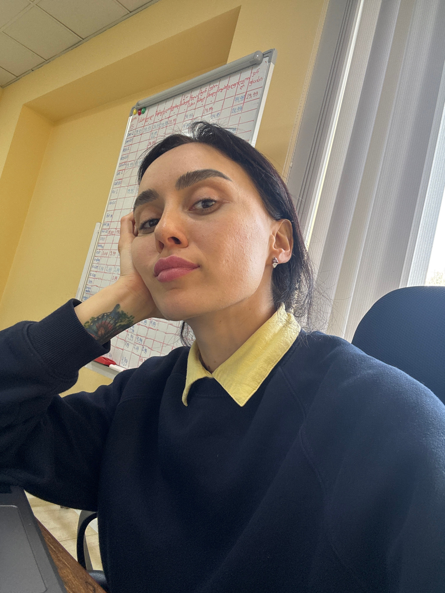 A medium shot shows a person with dark hair and eyebrows, leaning their head on their left hand, which has a visible butterfly tattoo on the wrist. The person is wearing a dark blue or black sweatshir…read more