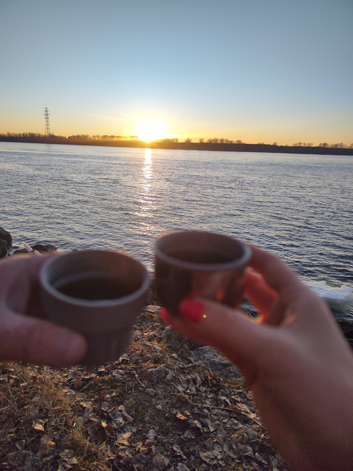 A close-up captures two hands holding small, dark cups in a toasting gesture. One hand is male, the other female with red nail polish. The focus is intentionally soft, rendering the hands and cups sliβ¦read more