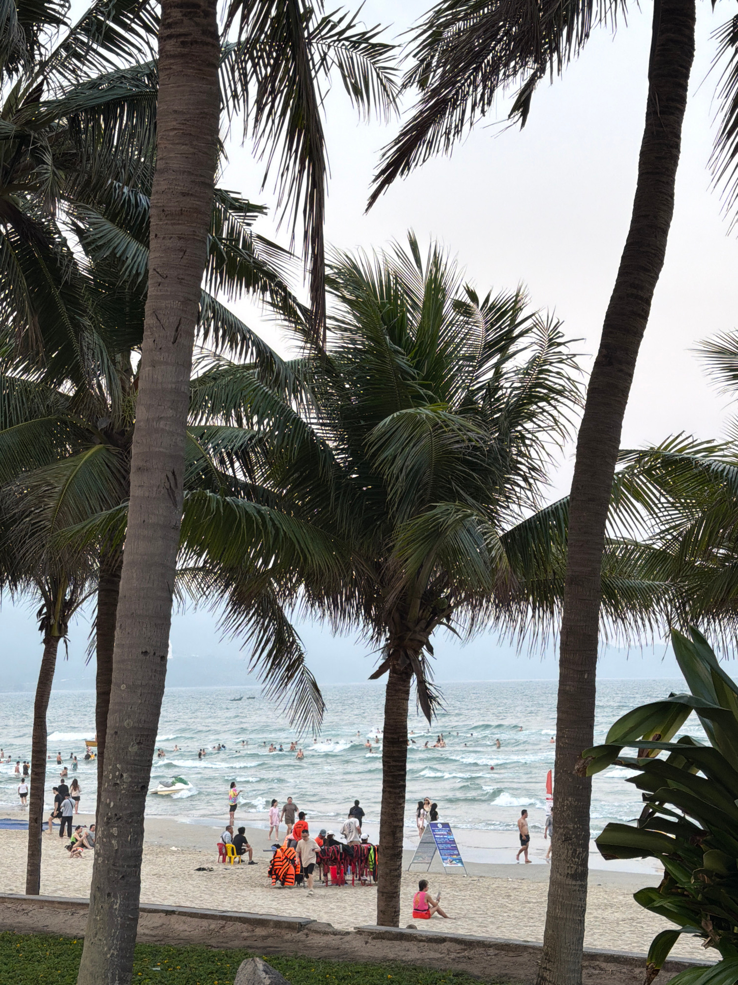 The photograph, taken at a low angle, depicts a crowded beach in Đà Nẵng, Vietnam, framed by multiple coconut palm trees. The view is directed toward the sea, where numerous people are swimming and pl…read more