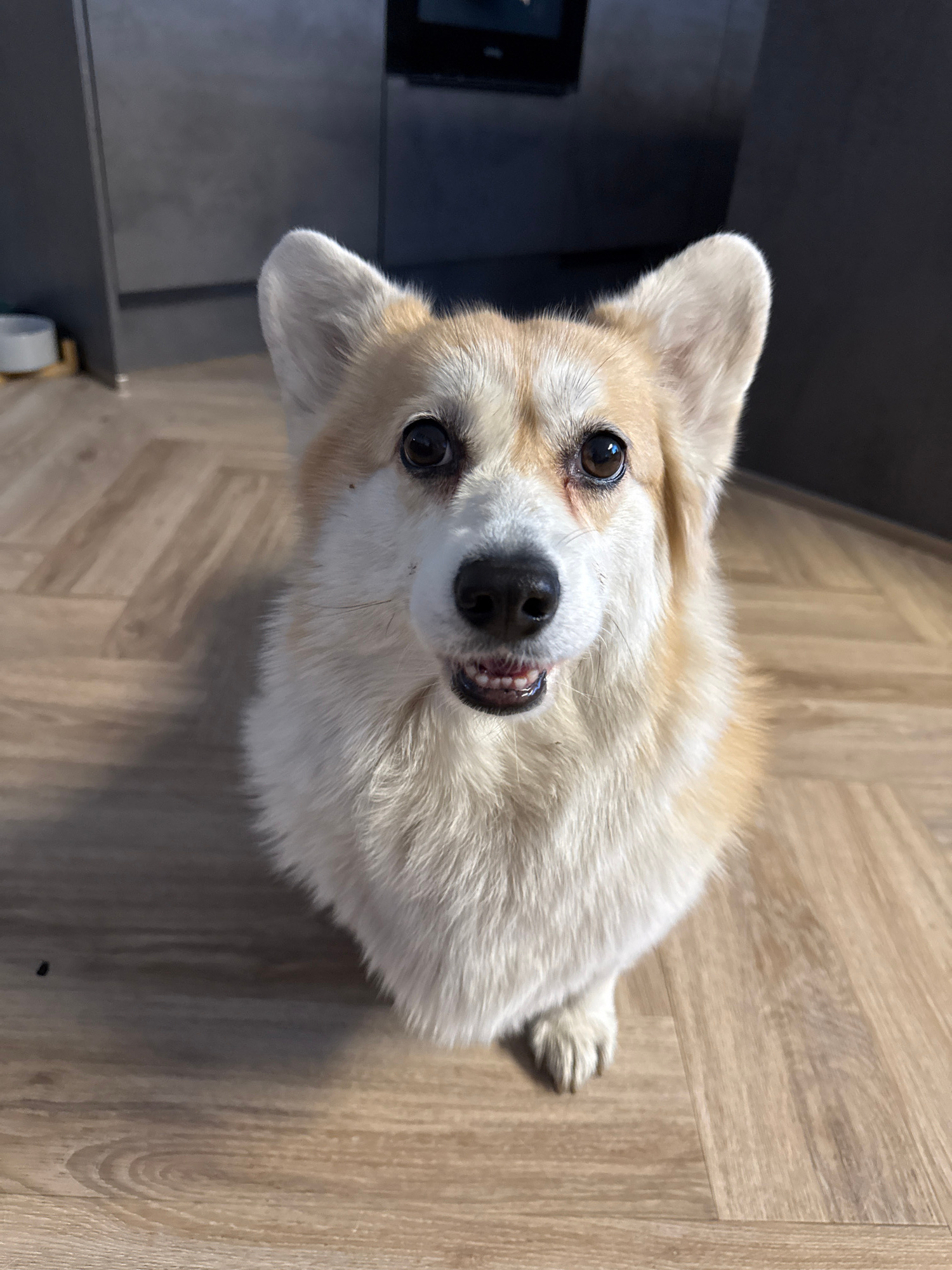 A close-up, high-angle shot shows a Corgi dog looking up at the camera. The dog has a light tan and white coat, with erect ears and dark eyes. Its mouth is slightly open, revealing its teeth. The back…read more