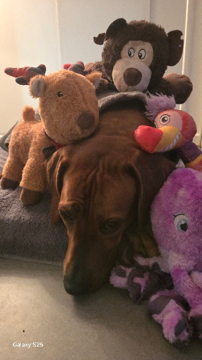 A brown dachshund is lying still and buried under stuffed animals. A plush reindeer with a red bow is positioned on its left side. Above it sits a cartoonish monkey with wide eyes and a smile. A color…read more