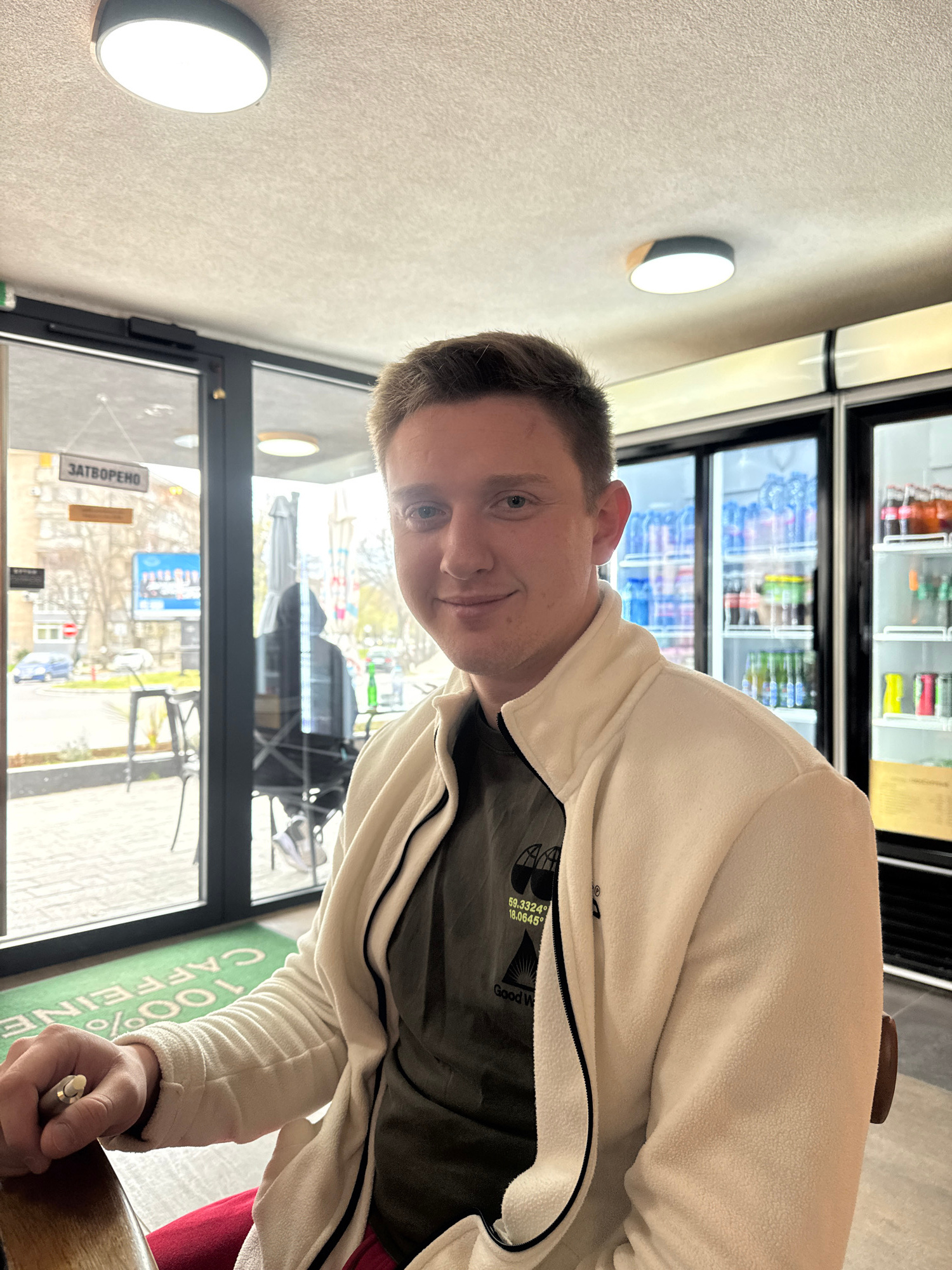A man with short brown hair is seated indoors, wearing a white jacket over a dark t-shirt. He is holding a pen in his right hand, resting it on a light brown table. Behind him is a glass-fronted refri…read more