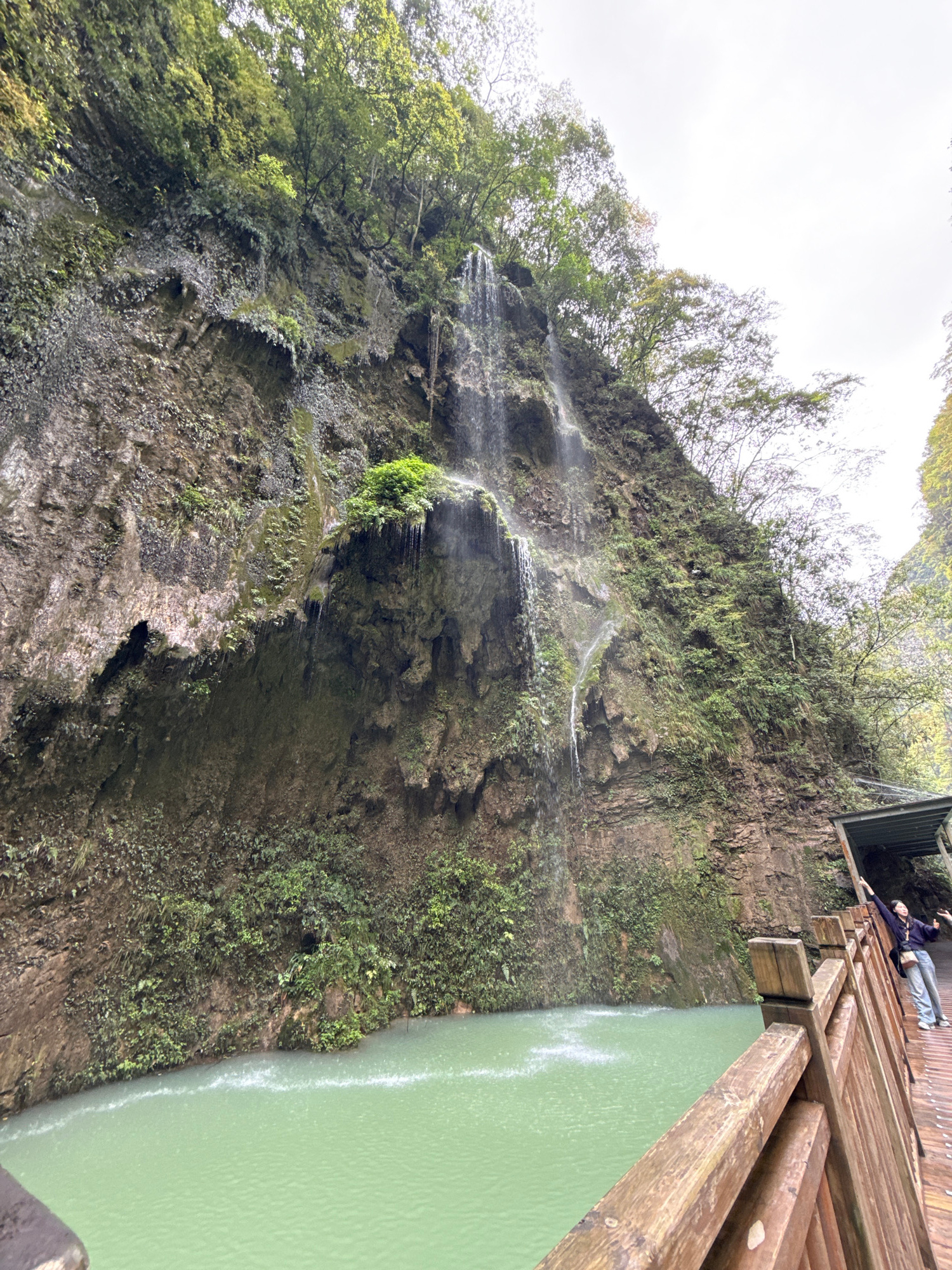 The image captures a scenic view of Baofeng Lake Waterfall in Zhangjiajie, China. A waterfall cascades down a steep, moss-covered rock face. The lake, a pale green color, lies at the base of the water…read more