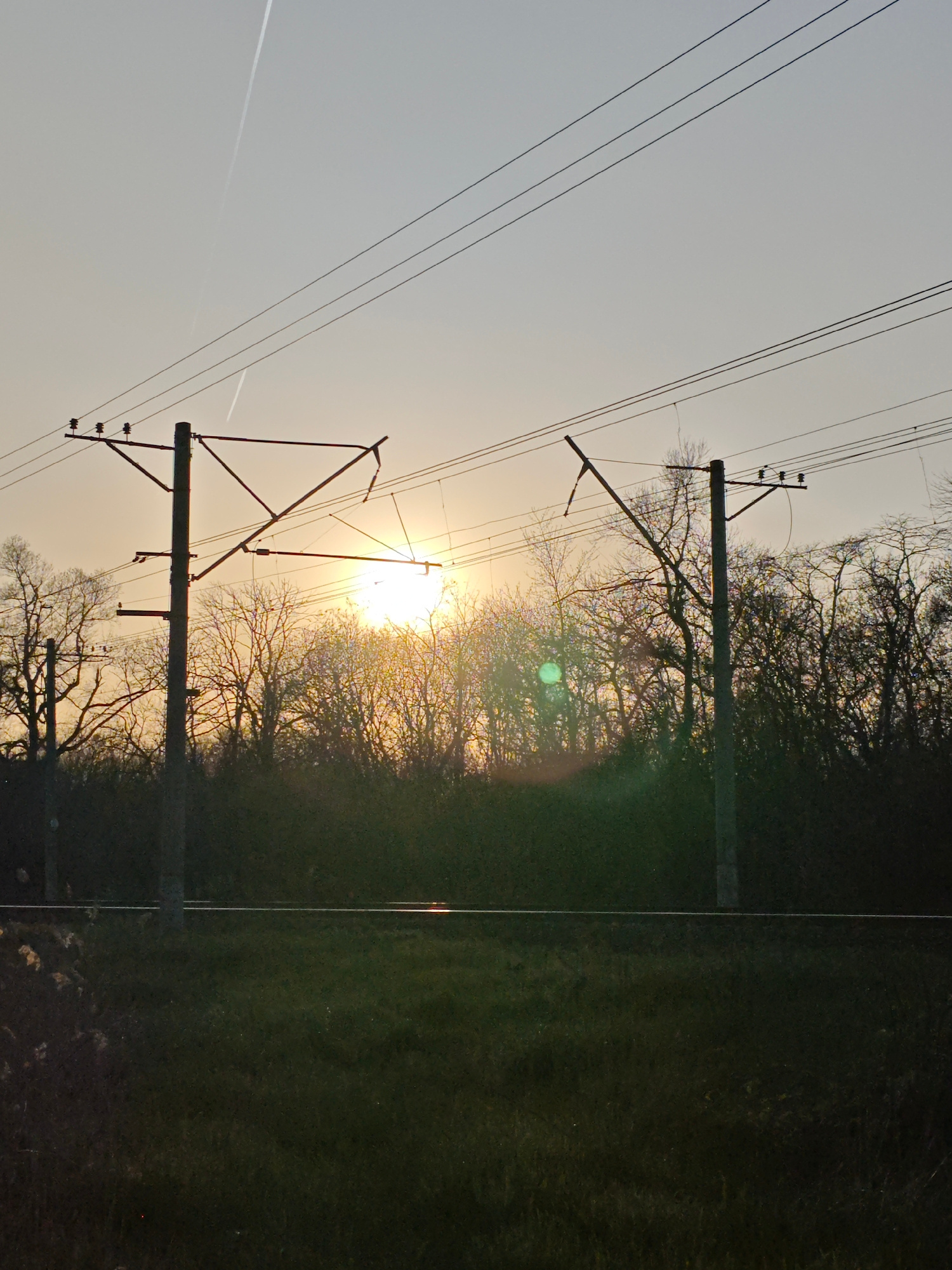 The image depicts a landscape at sunset, likely near Pyatigorsk, Russia, given the presence of overhead railway electrification structures characteristic of Russian railways. Two support masts for theβ¦read more