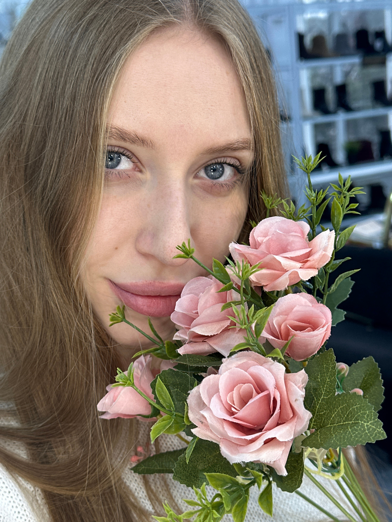 A close-up, rotated portrait captures a fair-skinned woman with light brown hair. Her eyes are blue-grey. She is positioned at an angle, with her face slightly tilted. A bouquet of light pink roses wi…read more