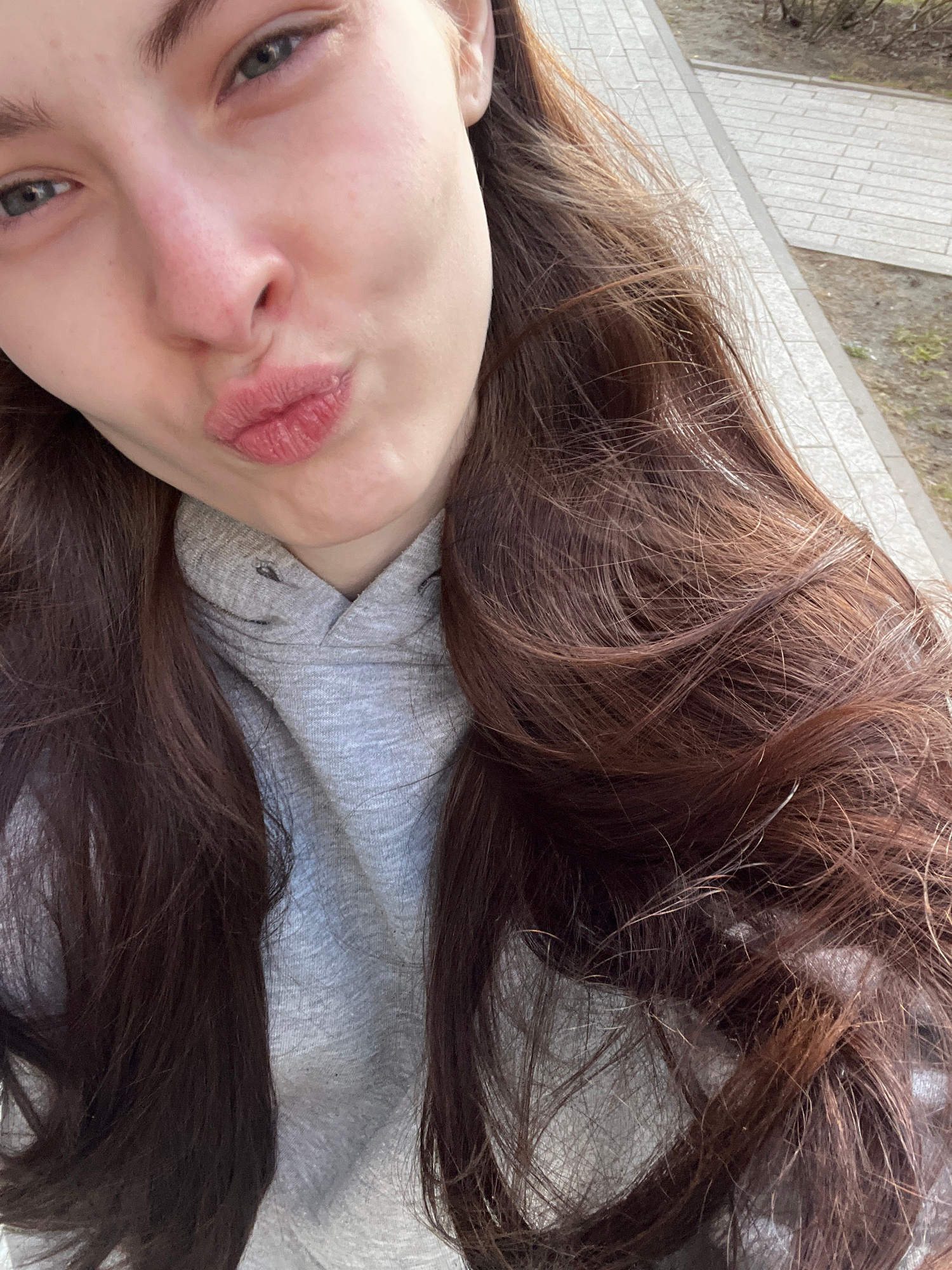 A close-up, slightly angled, high-angle shot shows a person with fair skin and long, wavy brown hair lying down, possibly outside. The person has pursed lips and visible facial features including eyes…read more
