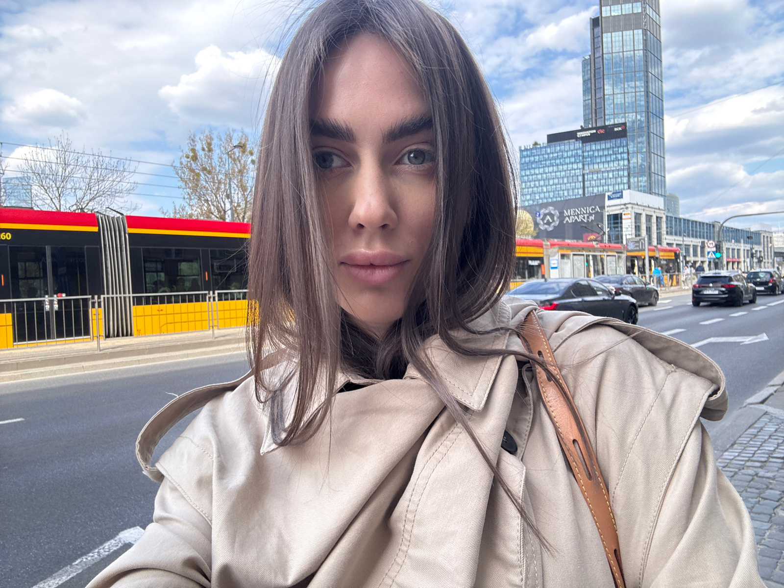 A selfie shows a woman outdoors in Warsaw, Poland. She wears a beige trench coat with a brown strap. Behind her is a city street with a yellow and red tram, cars, a skyscraper with "Mennica Apartments…read more