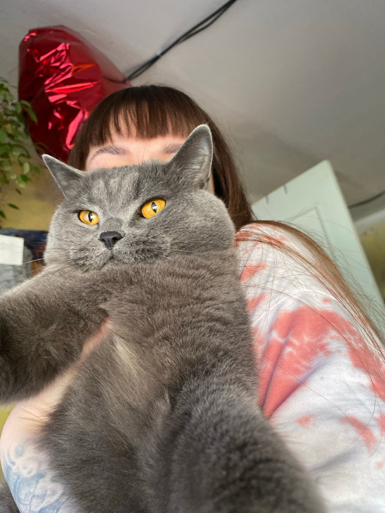 The image, captured with a tilted perspective, features a person and a grey British Shorthair cat in a close-up indoor shot. A person with long brown hair, wearing a white t-shirt with pink tie-dye pa…read more
