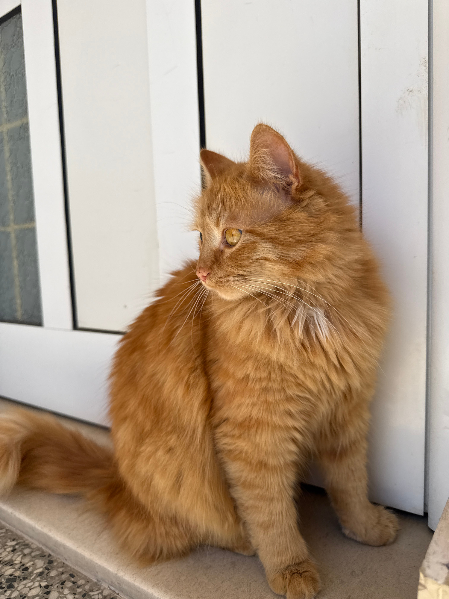 A medium-sized orange cat with long fur is lying down. The cat is positioned on a light gray, textured surface, likely a windowsill or ledge. Part of a white frame with horizontal grooves is visible b…read more