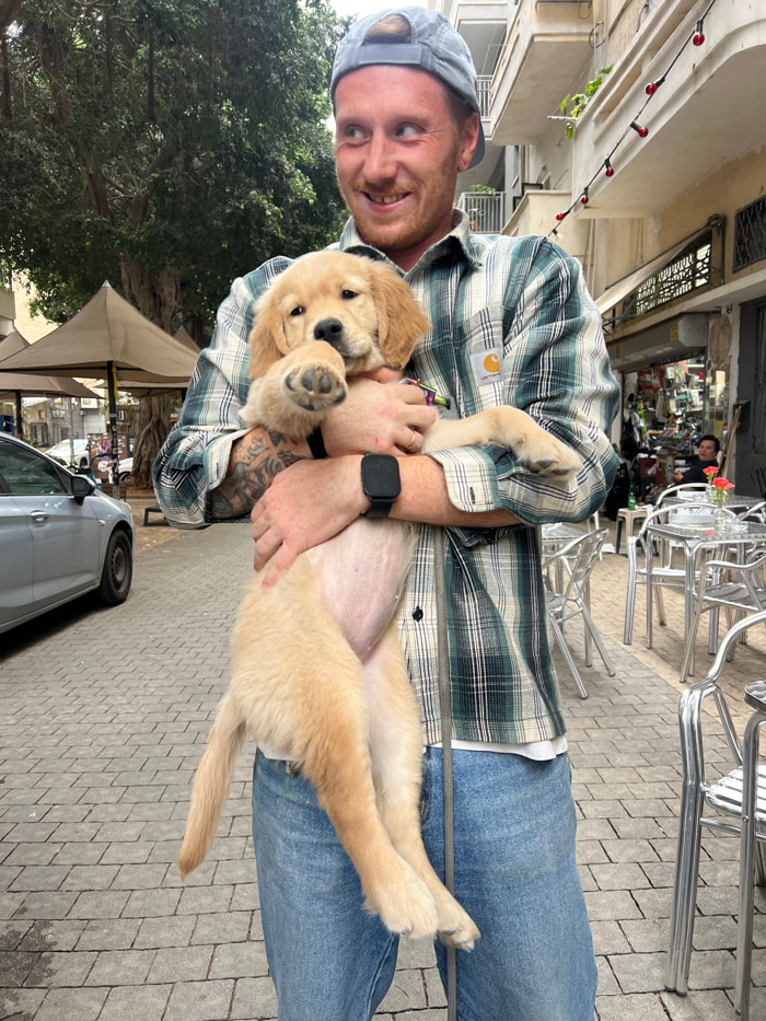Located in Tel-Aviv, Israel, a young adult male stands on a paved pedestrian street, holding a light golden golden retriever puppy. The man has light skin, reddish facial hair, and is wearing a backwa…read more