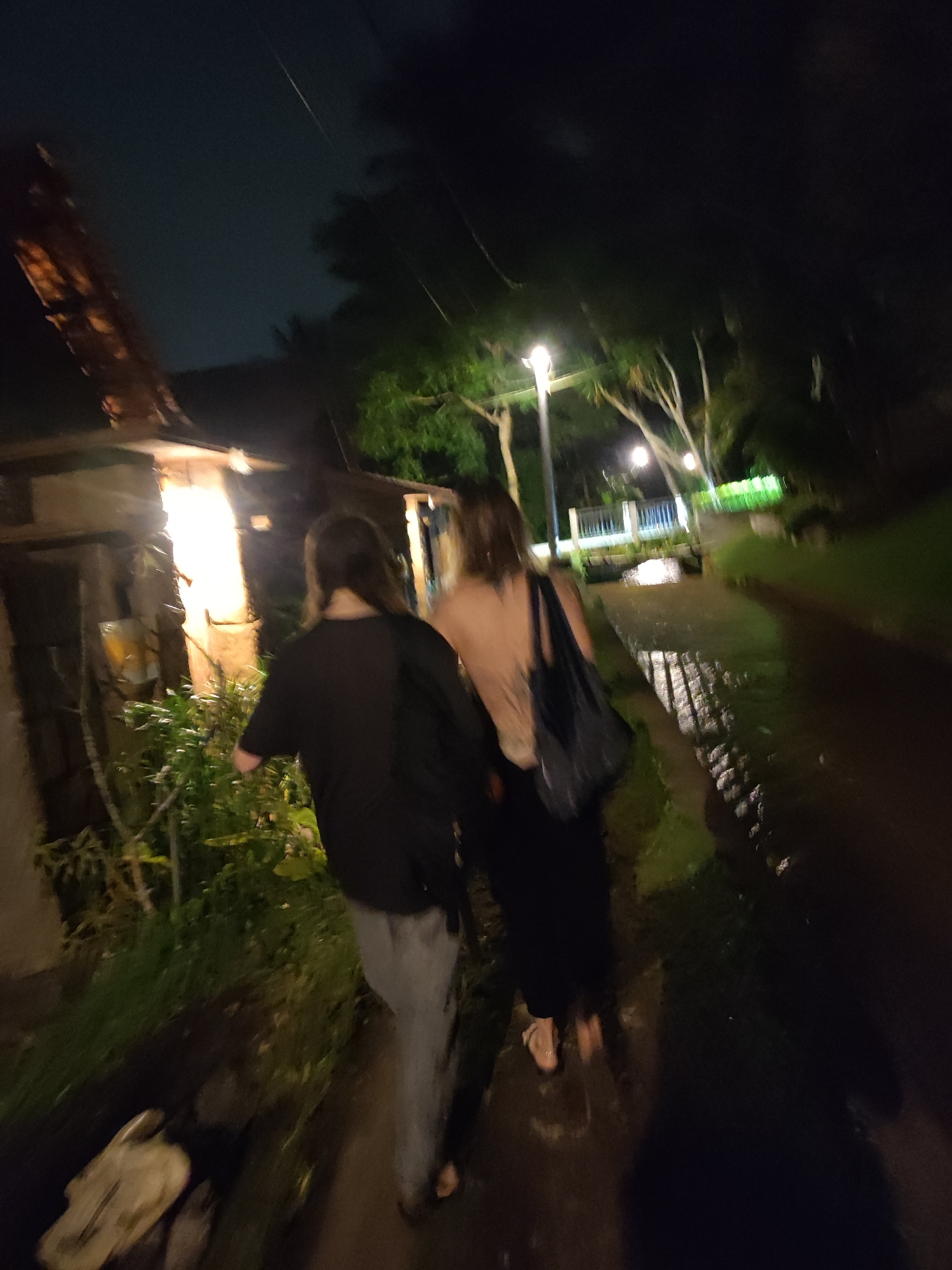 At night in Lokaserena, Indonesia, two individuals are walking along a paved pathway adjacent to a water-filled ditch. One individual wears a black shirt and light-colored pants, while the other wears…read more
