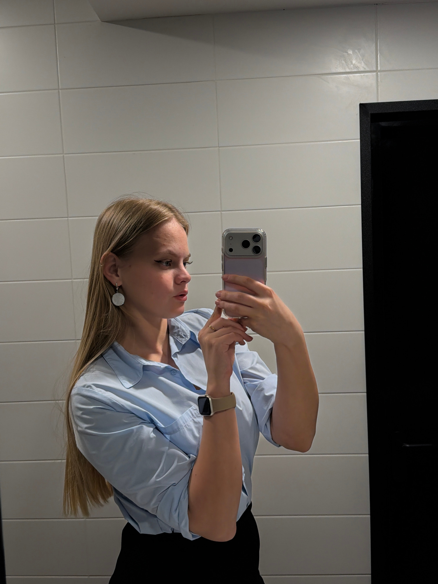 A woman is taking a selfie in a bathroom. She is wearing a light blue button-down shirt, a watch, and earrings. The background consists of white tiles and a black rectangular object, possibly a mirror…read more