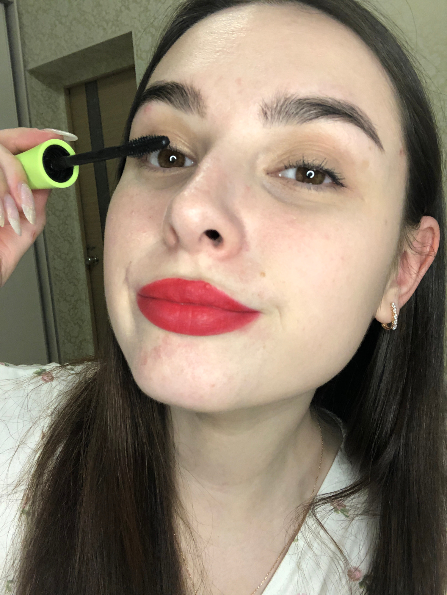 A fair-skinned woman with brown hair and light brown eyes is applying mascara to her lower eyelashes. She is wearing red lipstick. Her nails are long and appear to have glitter polish. She has a small…read more