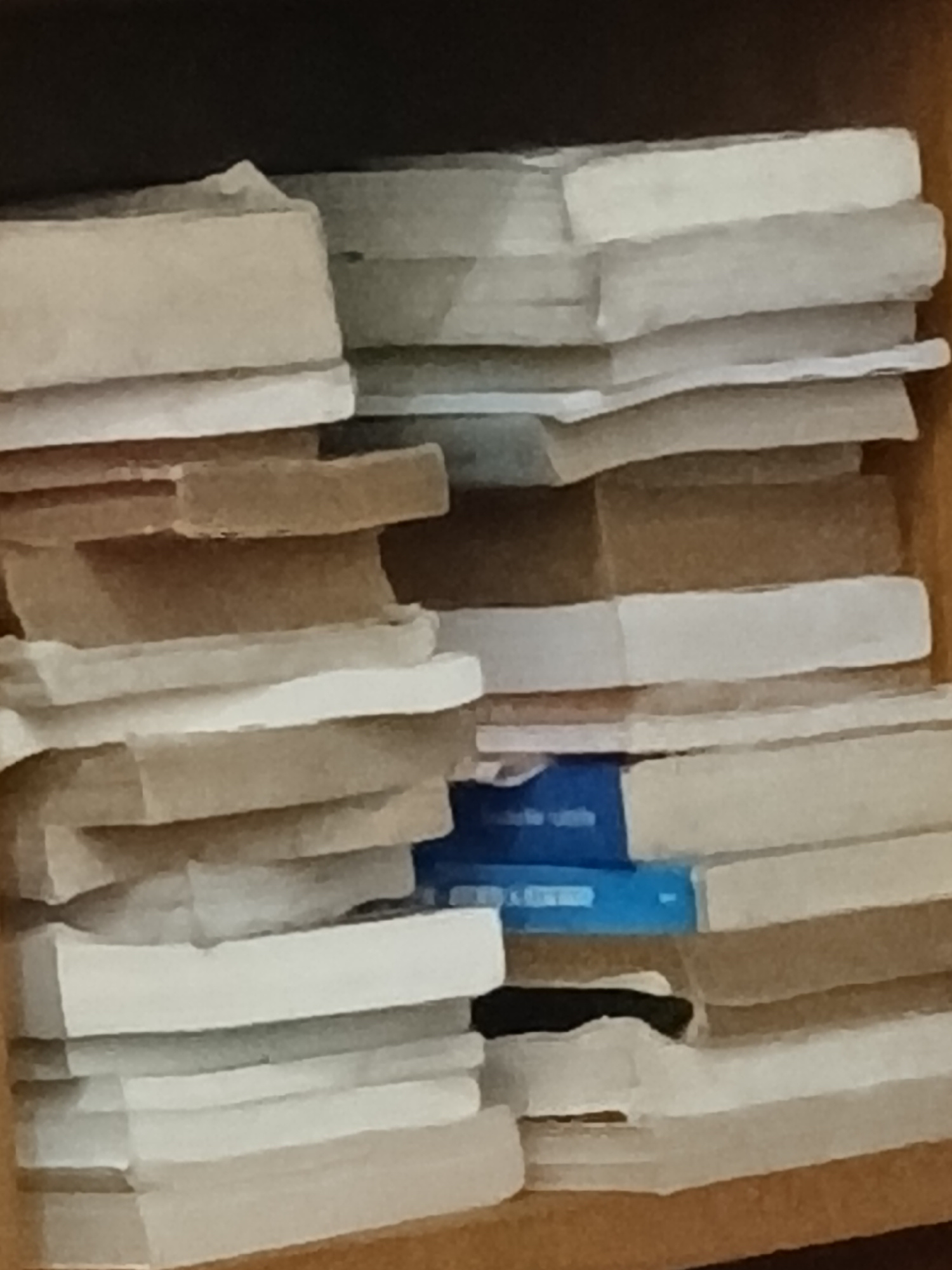 The image shows a container, likely a drawer, filled with white and beige-colored rectangular objects. One blue object is visible among the rest. The objects appear to be densely packed and are arrang…read more
