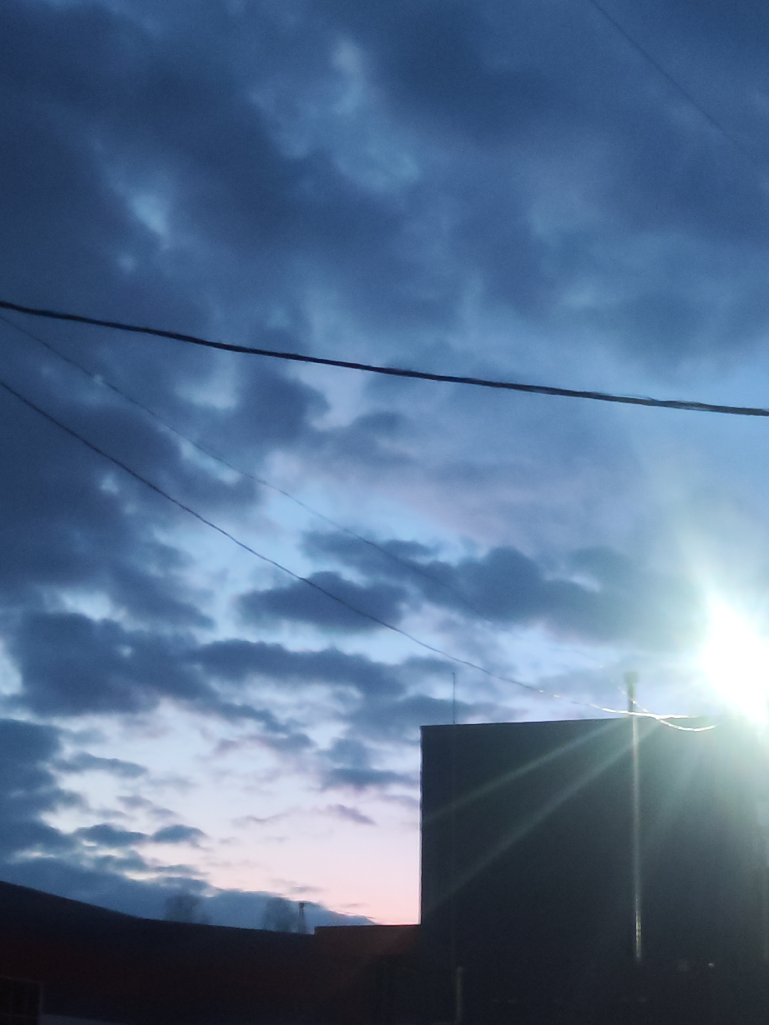 The image shows a twilight sky over Chaikovsky, Russia. The sky is predominantly blue with patches of dark, layered clouds. Power lines stretch across the upper portion of the frame. In the lower port…read more