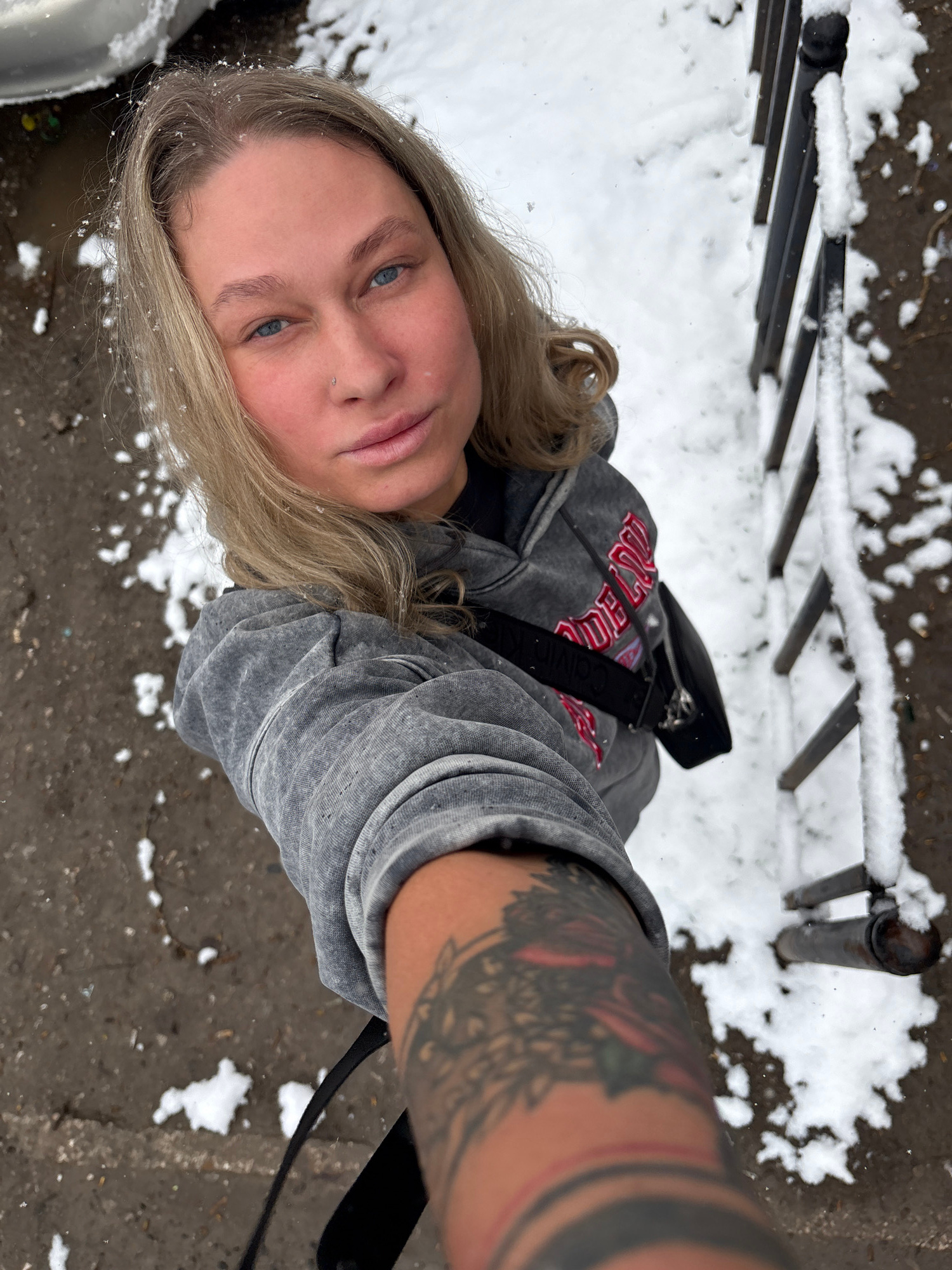The photograph is a selfie taken outdoors in a city environment, likely in Perm, Russia, based on the sweatshirt. The subject is a fair-skinned woman with blonde hair and blue eyes, wearing a gray swe…read more