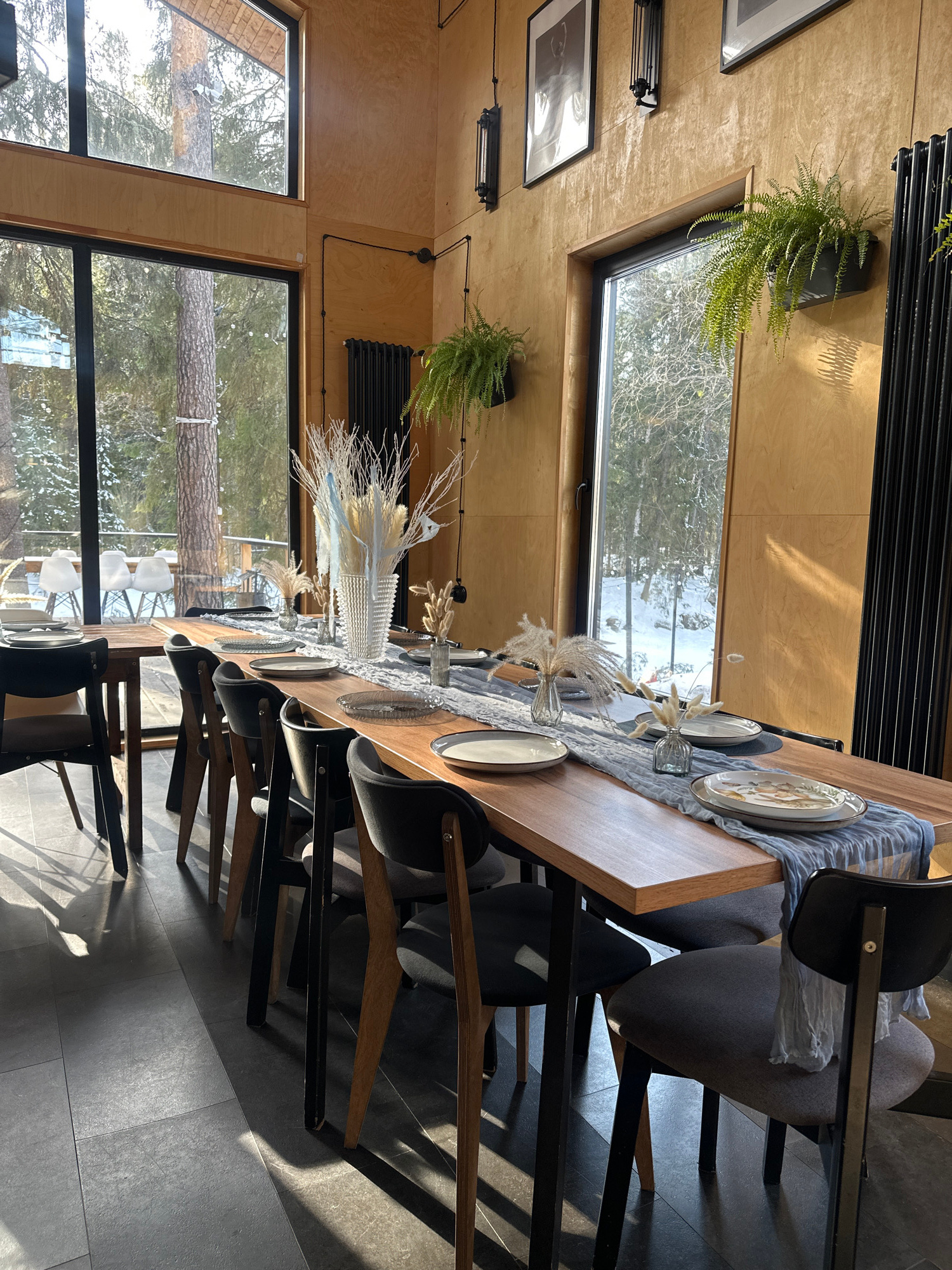 The image depicts an interior dining area with a long wooden table set for a meal. There are multiple place settings, a decorative table runner, and floral arrangements. The chairs are a mix of gray u…read more