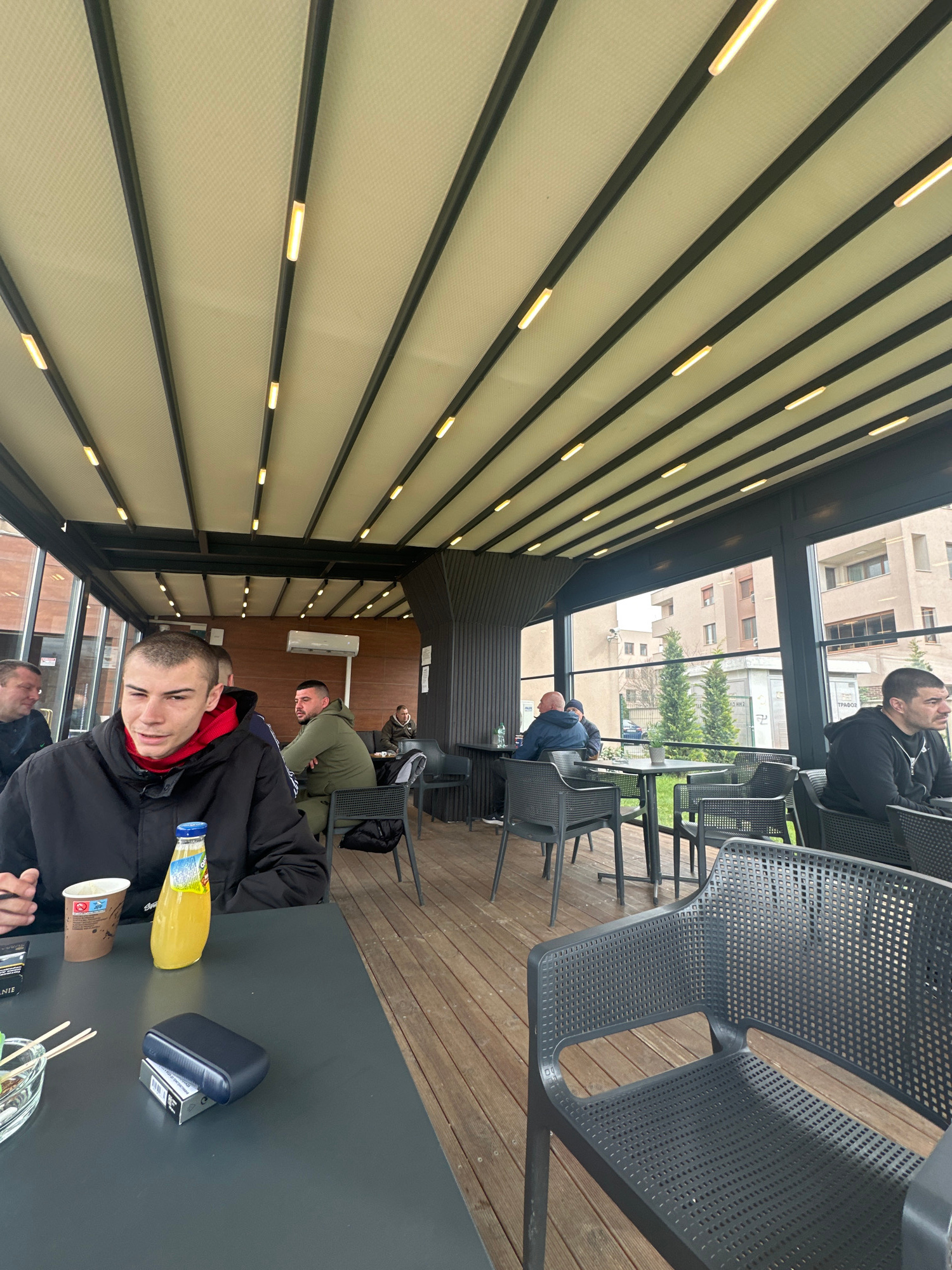 The image depicts a group of men in an outdoor cafe setting. A man sits at a dark-colored table where a juice bottle, a disposable cup, a pack of cigarettes, and a glass dish with what appears to be f…read more