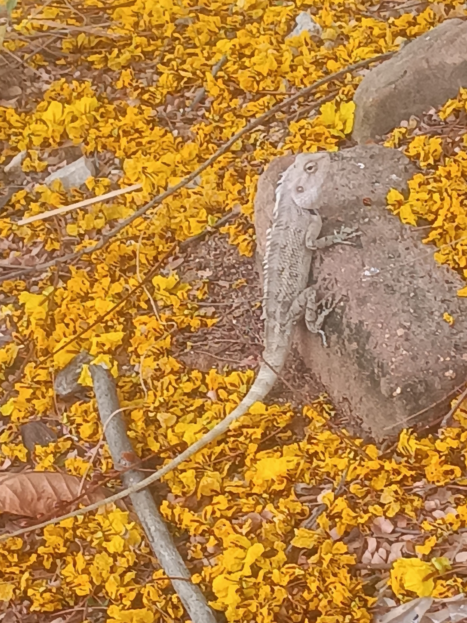 A lizard is perched on a rock amidst a ground covered in fallen yellow flowers in Puttaparthi, India. The lizard is light gray with dark markings, and has a long tail that curves down to the left. The…read more