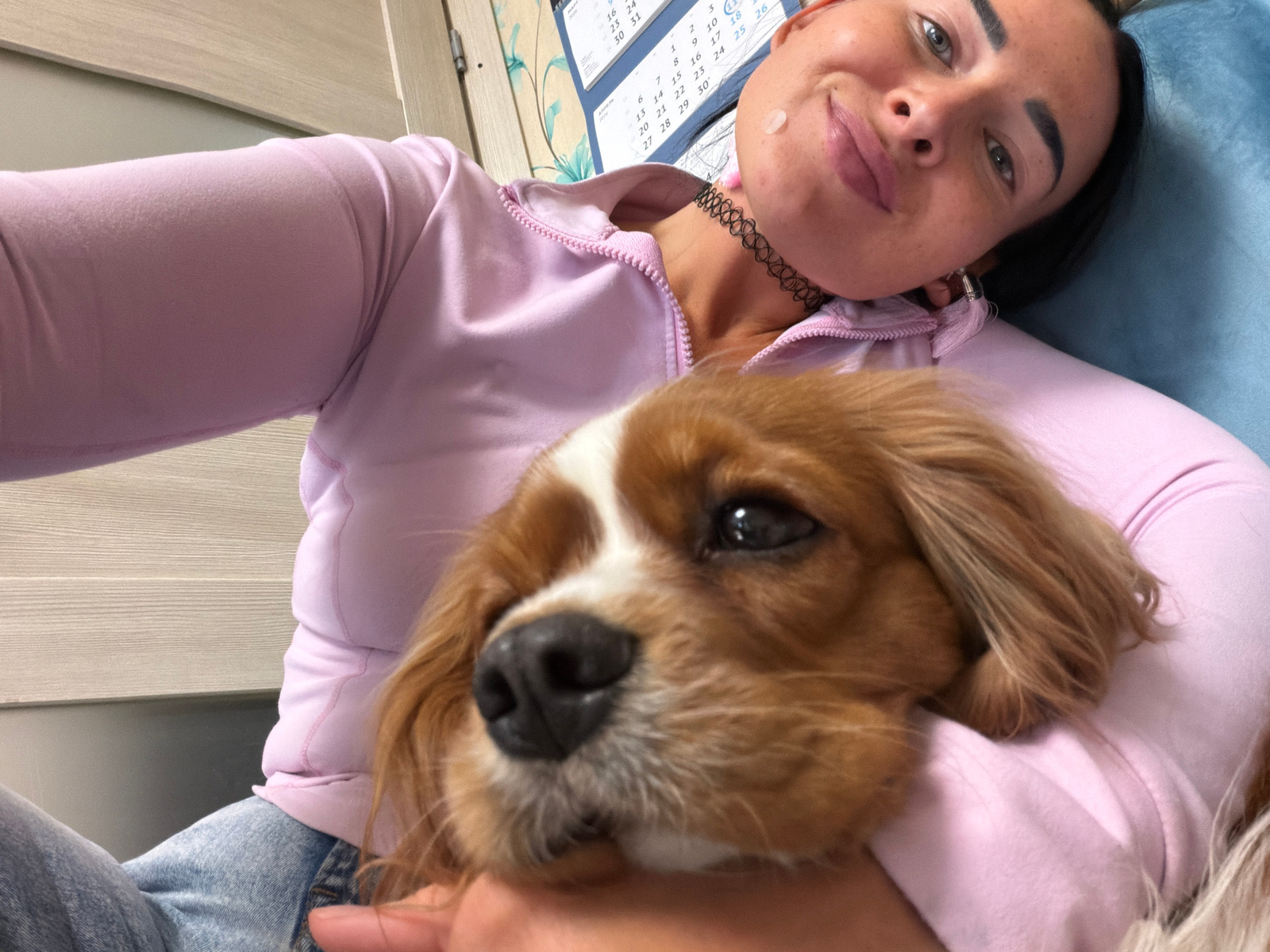 A woman lies on a blue surface, her head near a calendar dated April 2016. She is wearing a light purple zipped sweatshirt and a black choker. A brown and white dog rests its head on her chest. The lo…read more