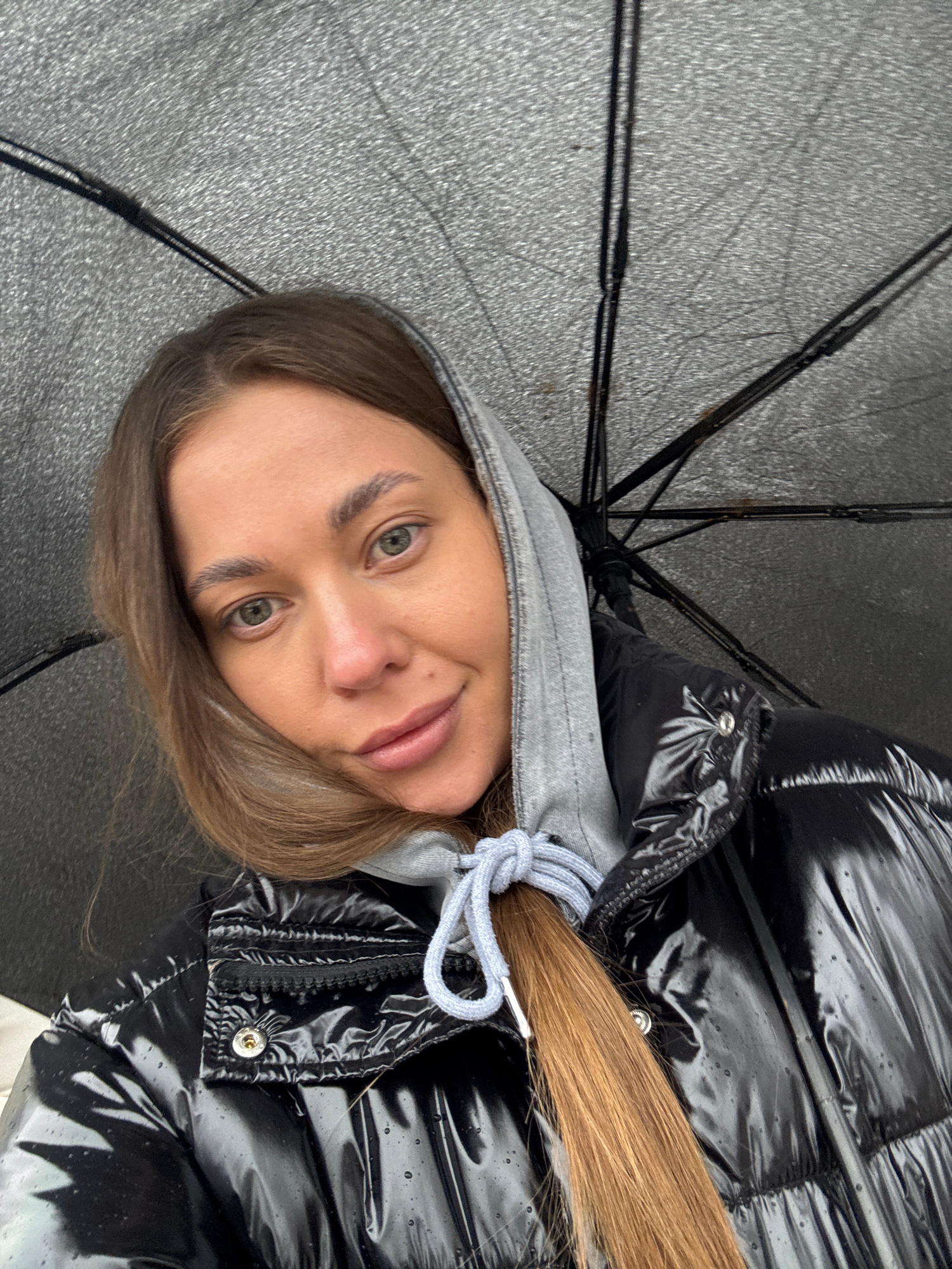 A woman is holding an umbrella. She is wearing a gray hooded sweatshirt and a shiny black puffer jacket. The inside of the umbrella is silver-gray. The image was taken from a low angle, looking up at…read more