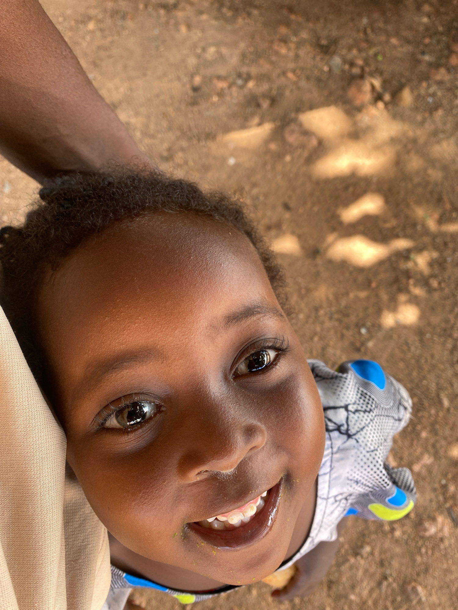 The image features a close-up, high-angle portrait of a young child with dark skin, looking directly upwards at the camera. The child's face, framed by dark, curly hair, is dominated by a wide, radian…read more