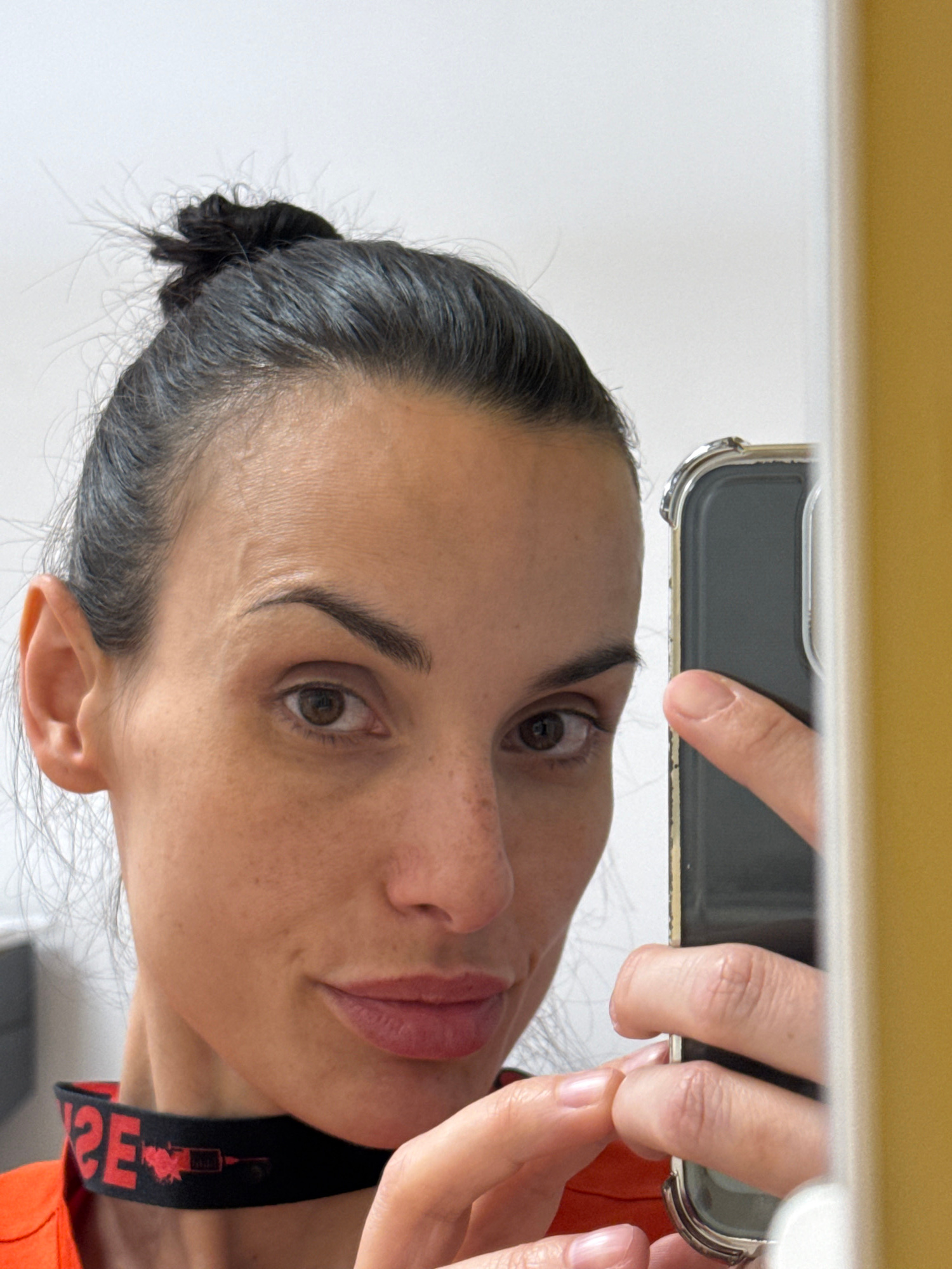 A woman is taking a selfie in a mirror. She has dark hair pulled back into a bun, light skin with freckles, and dark eyebrows. She is holding a smartphone with a dark case in her right hand. She is we…read more