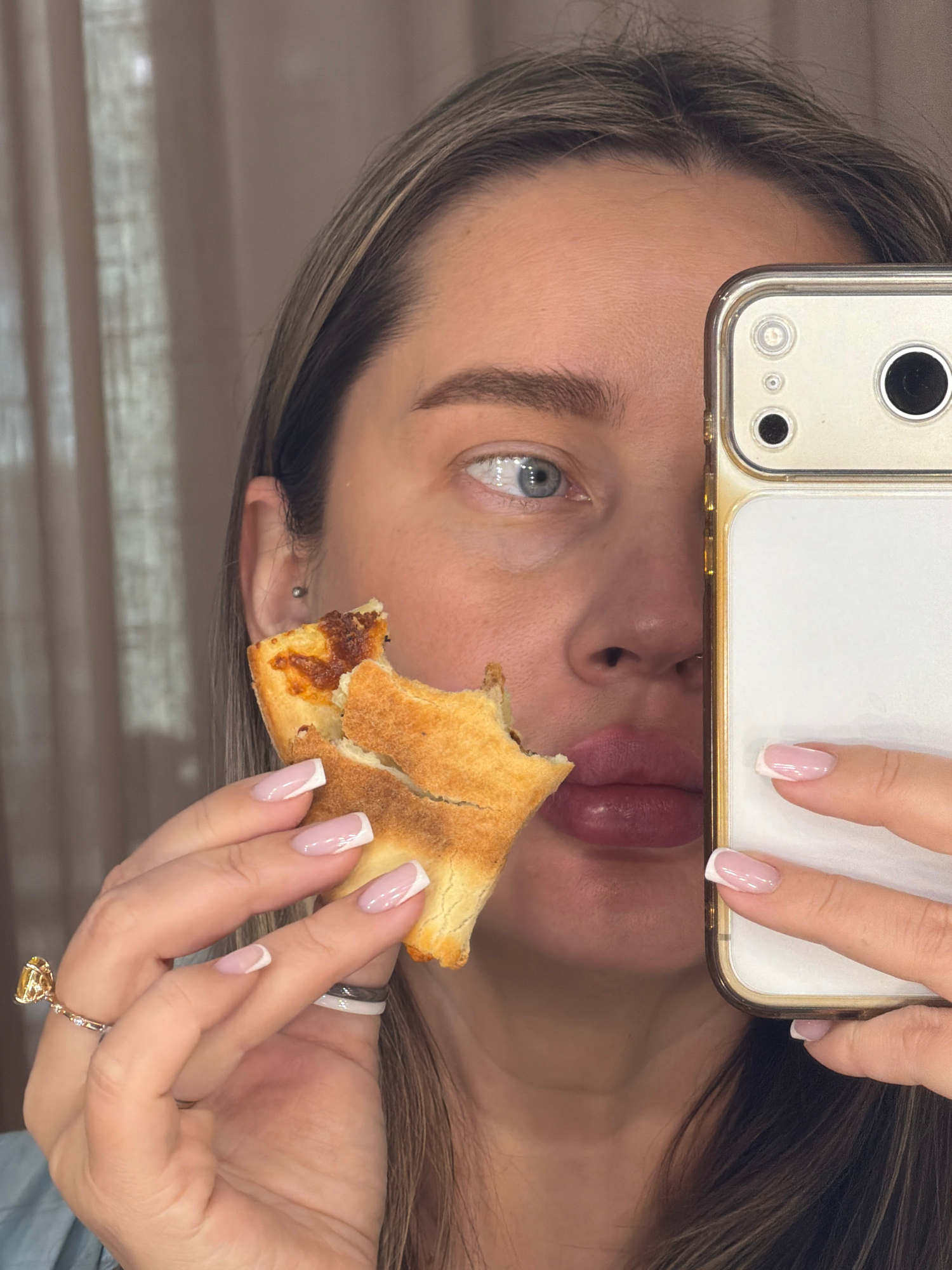 A woman is positioned in front of what appears to be a beige window, holding a partially eaten piece of pizza in her right hand and a white smartphone in her left hand. The phone is positioned such th…read more