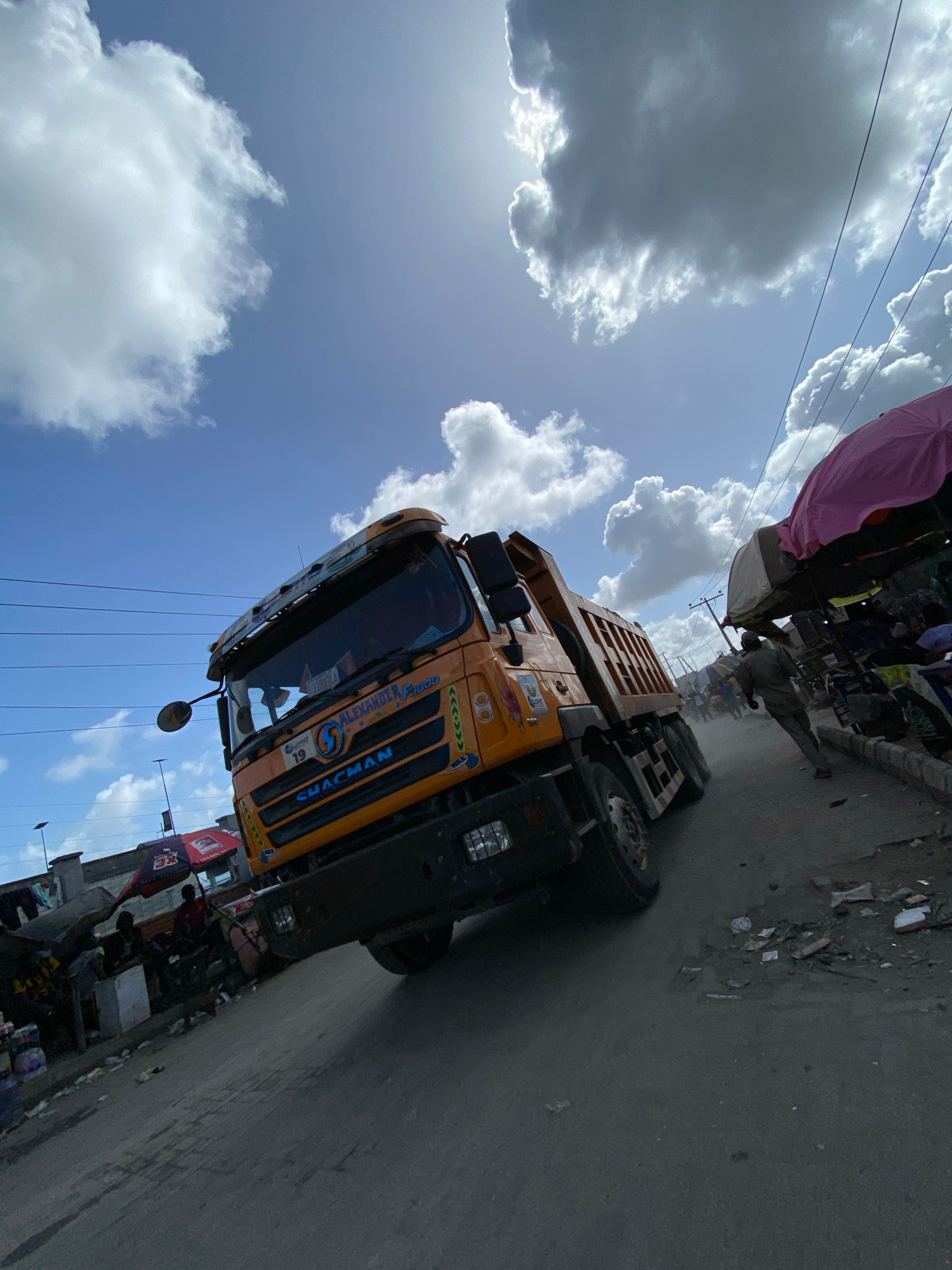 The image depicts a street scene in Lagos, Nigeria. A yellow dump truck with "Alexander 4800" and "Shacman" markings is prominently featured on the right side of the frame. The truck is angled towards…read more