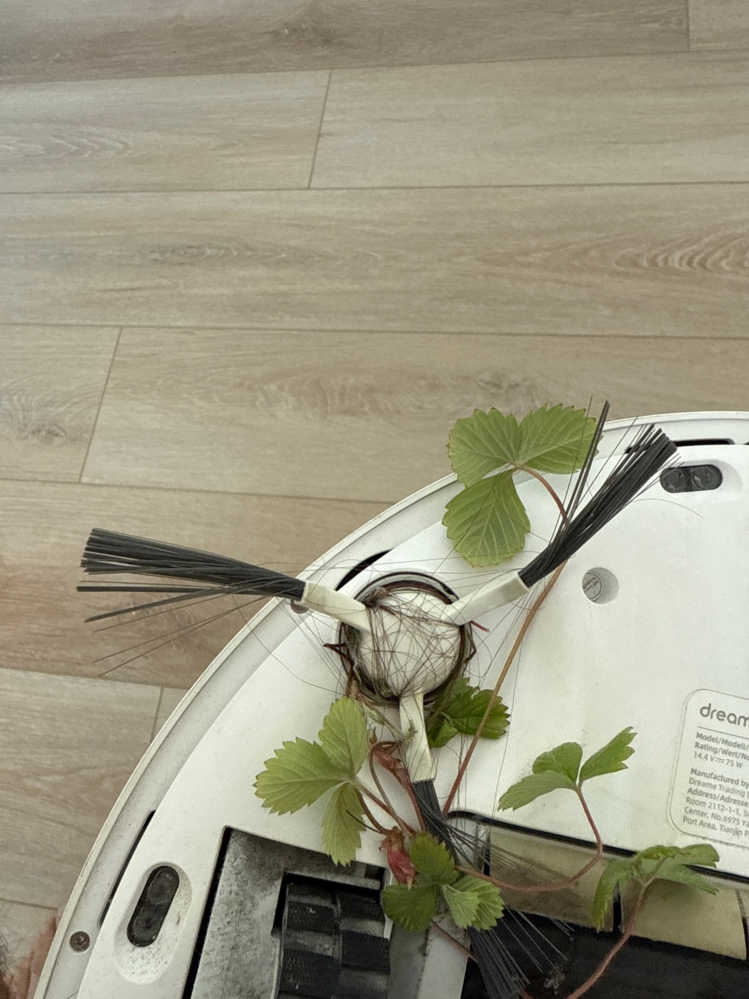 An overhead shot reveals the underside of a white robotic vacuum cleaner, positioned on a light-colored wooden floor. The vacuum's side brushes are heavily tangled with a significant amount of human h…read more
